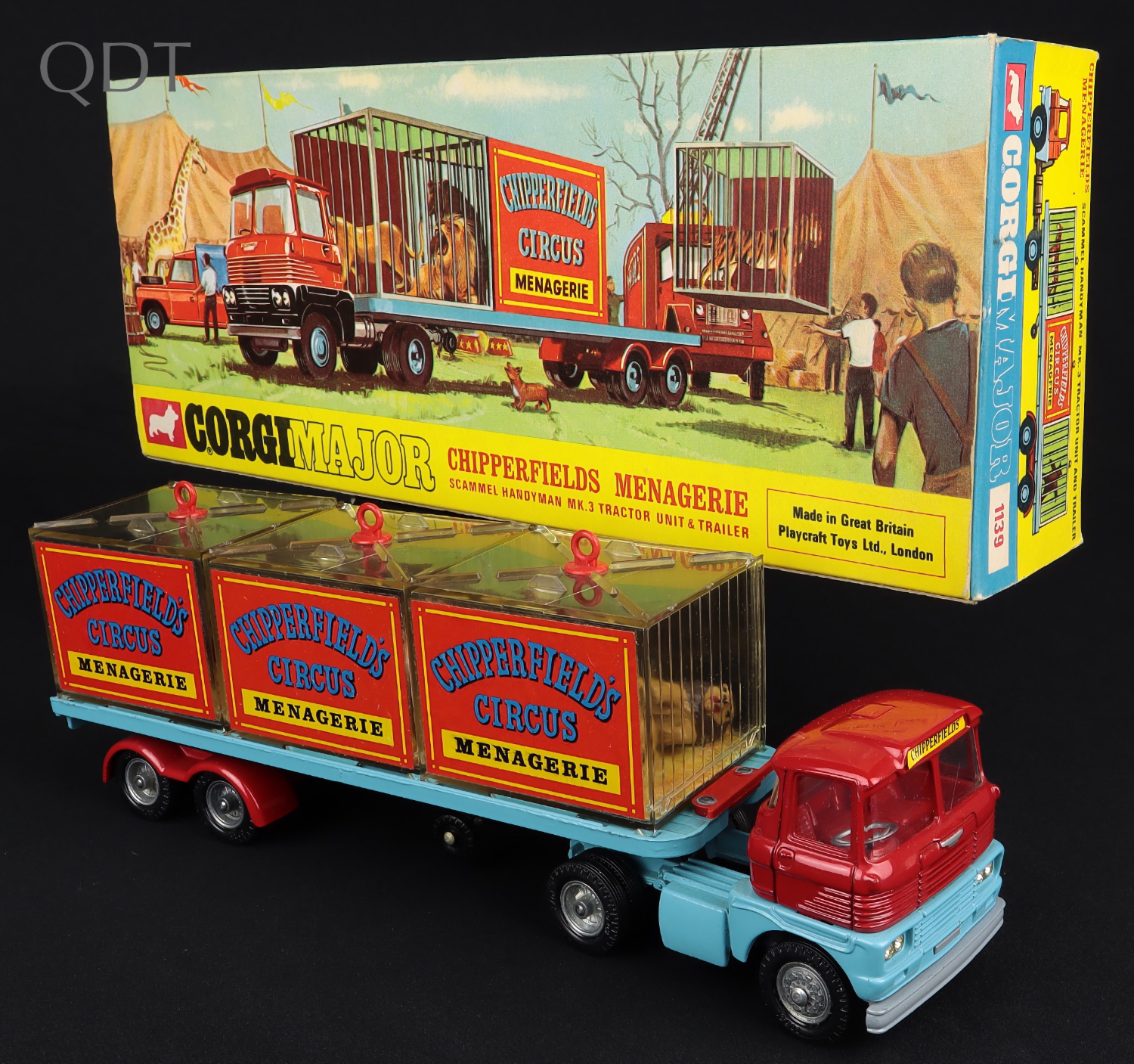 It contains a Scammell truck with three decorative plastic cages containing two lions, two tigers and two bears. This example has a bright red and blue paint finish, jewelled headlights and Chipperfields label at cab front. Highly detailed decorative labels on both sides are notably complete.
