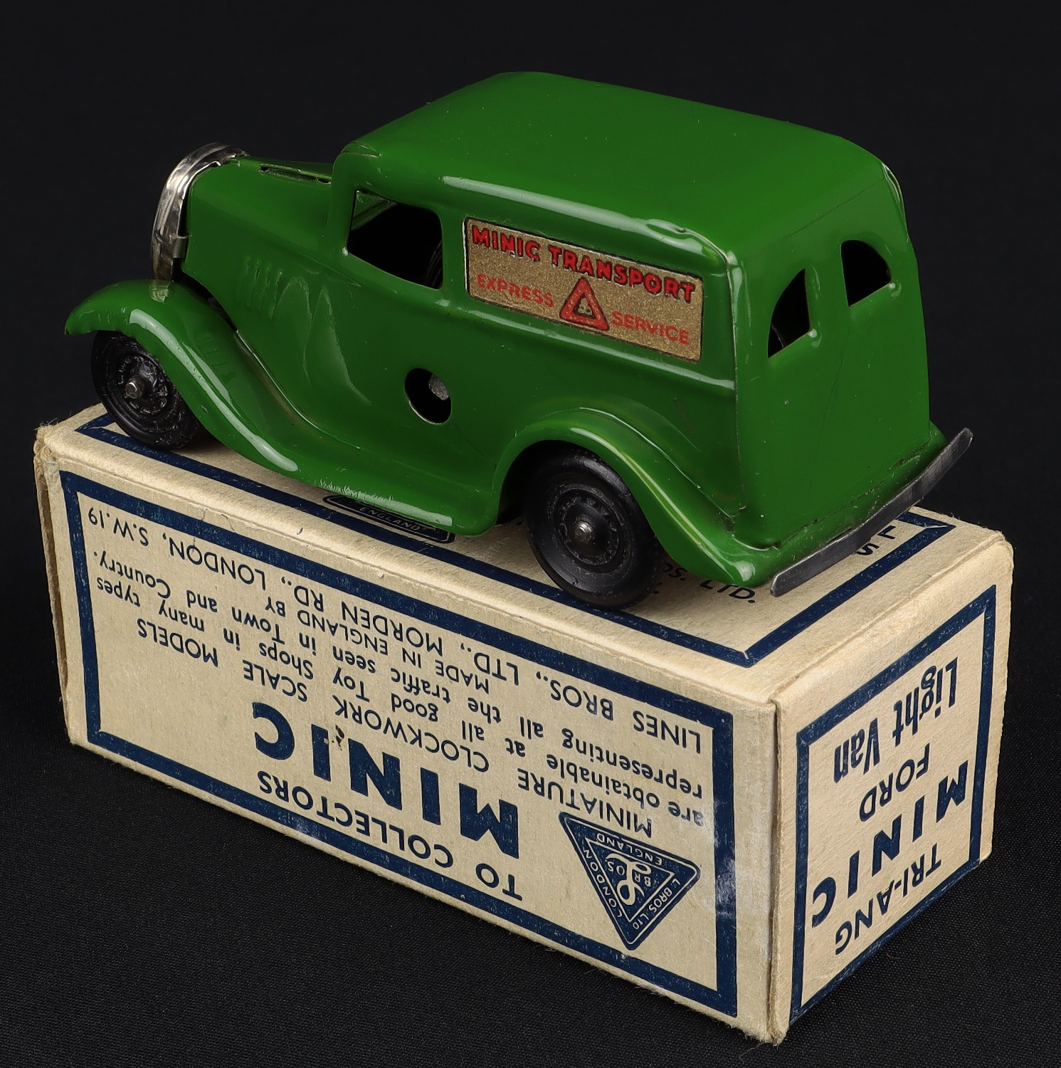 An endearing reminder of a bygone age, this Ford Light Van in vivid green with complete attractive ‘MINIC TRANSPORT’ transfers on both sides. This post-war version measures just 8.5 cms.