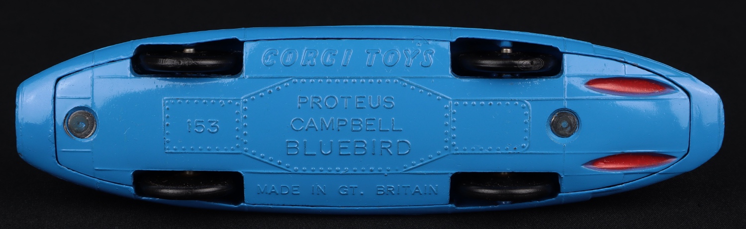 Proteus Campbell Bluebird Record Car by Corgi Toys, No. 153. Very, very near mint/boxed. 1st issue with complete U.K. Crossed Flags & black plastic wheels. From The Elmer Collection of Corgi Toys. Starting bid £195. Please note that QDT apply 12.5% buyer's commission.