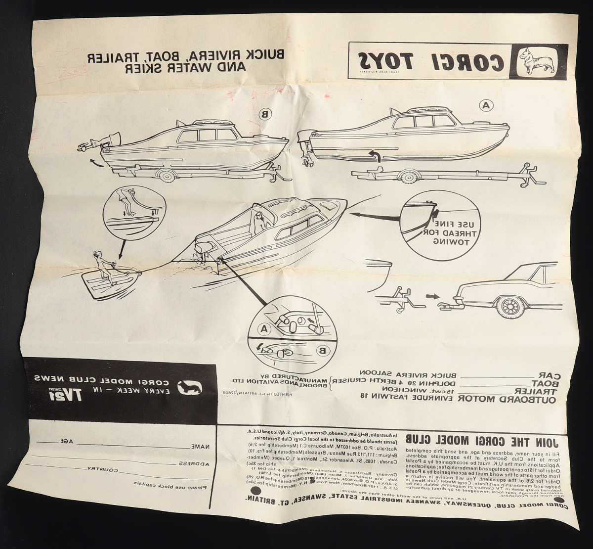 iii) Corgi 104 Dolphin Cabin Cruiser is in fresh, bright and clean condition, with a clean and complete label. Includes original Captain figure, intact outboard motor and propellor. Virtually mint.