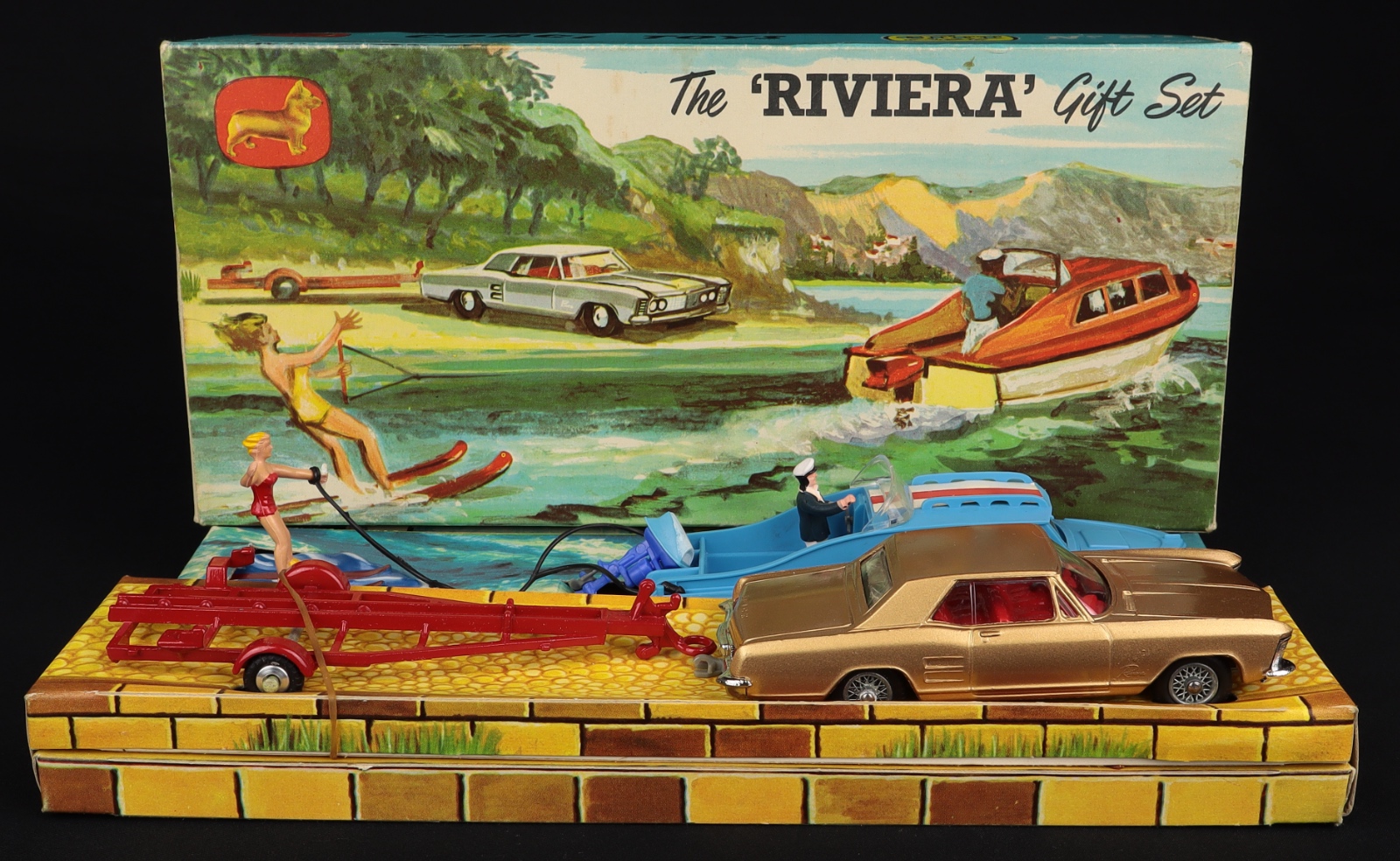 Corgi Gift Set 31 The 'Riviera' Gift Set. Very, very near mint/boxed, with card packing & model specific leaflet. GOLD Riviera issue. Scarce Gift Set from The Elmer Collection. QDT starting bid £250. Please note that QDT apply 12.5% buyer's commission.