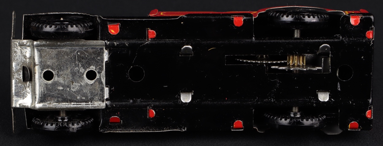 This eye-catching Mechanical Petrol Lorry in bright red and black with lithography details and bright ‘BP’/‘SHELL’ lettering at the sides. Working clockwork motor. One-piece black plastic wheels with tyre detail. Complete ‘BRIMTOY BRAND BRITISH MADE’ on both cab sides and at the rear of the tanker section. Complete radiator and headlight assembly. Shiny metal parts. Measures approx 11cms.