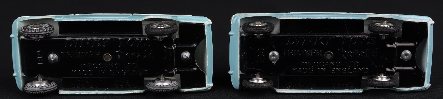 Old shop stock find. 2 boxed examples remain in this original Trade Dinky Carton (as they would have been sent to the shop back in the day). Very close to immaculate Triumph Herald models in a pale blue and white finish with a bright baseplate. Complete and intact with suspension on shiny shaped spun wheels. A popular Dinky car issued during 1959-64.