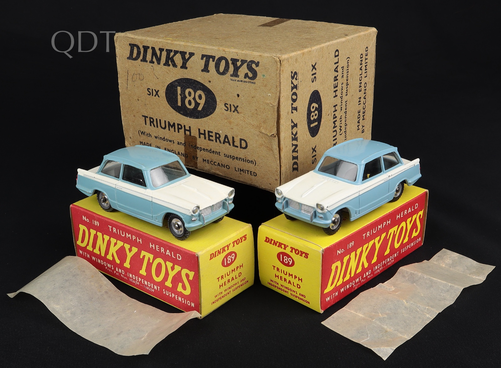 2 x Triumph Heralds by Dinky Toys, No. 189. In original Dinky Trade Carton. Very near mint -very, very near mint/boxed. Pale blue and white versions. With slip of original packing greaseproof! From The Reference Collection. Starting bid £150. Please note that QDT apply 12.5% buyer's commission.