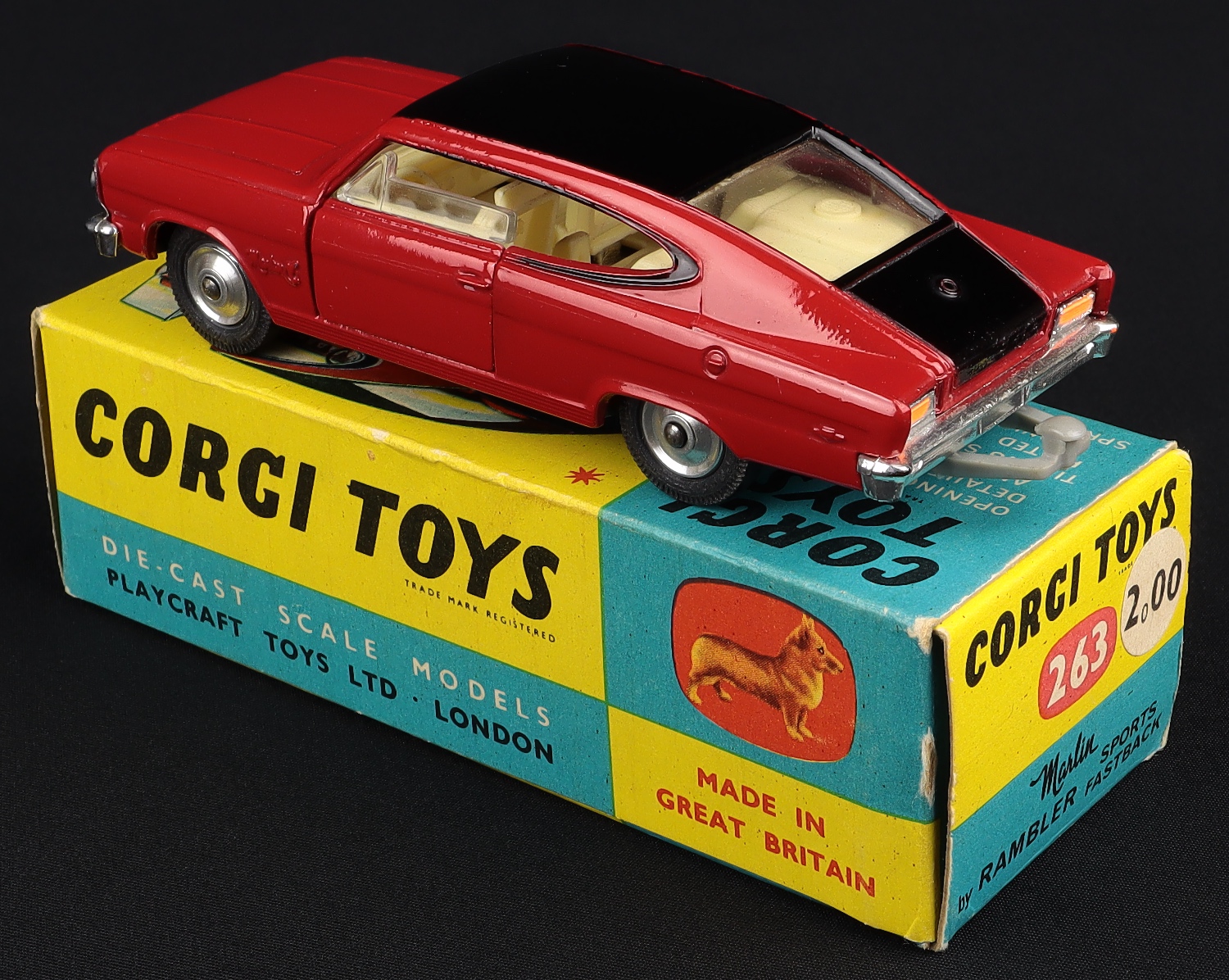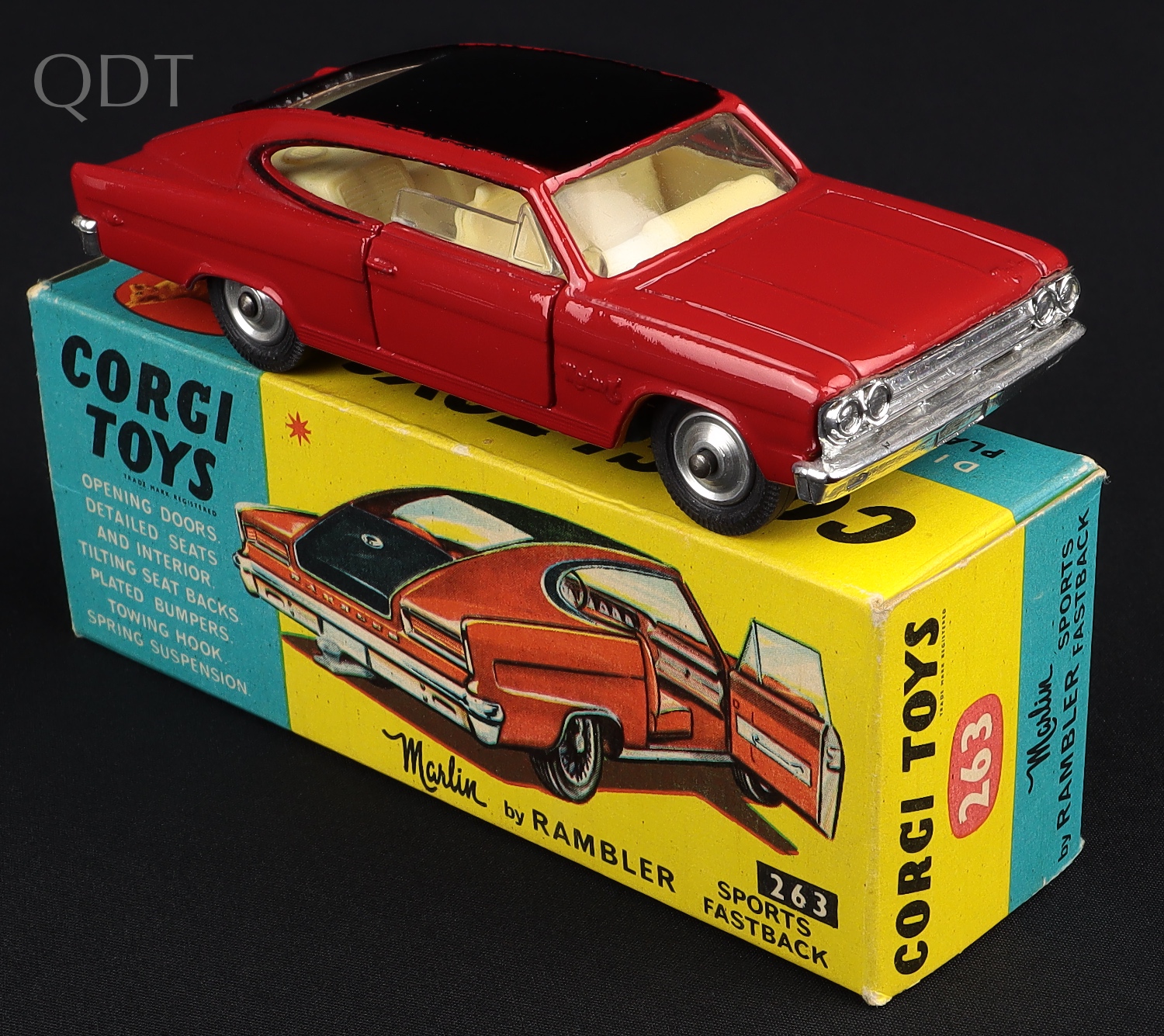 Marlin Rambler Sports Fastback by Corgi Toys, No. 263. Very near mint/boxed. Scarce with spun wheels. From The Rickman Collection. Starting bid £125. Please note that QDT apply 12.5% buyer's commission.