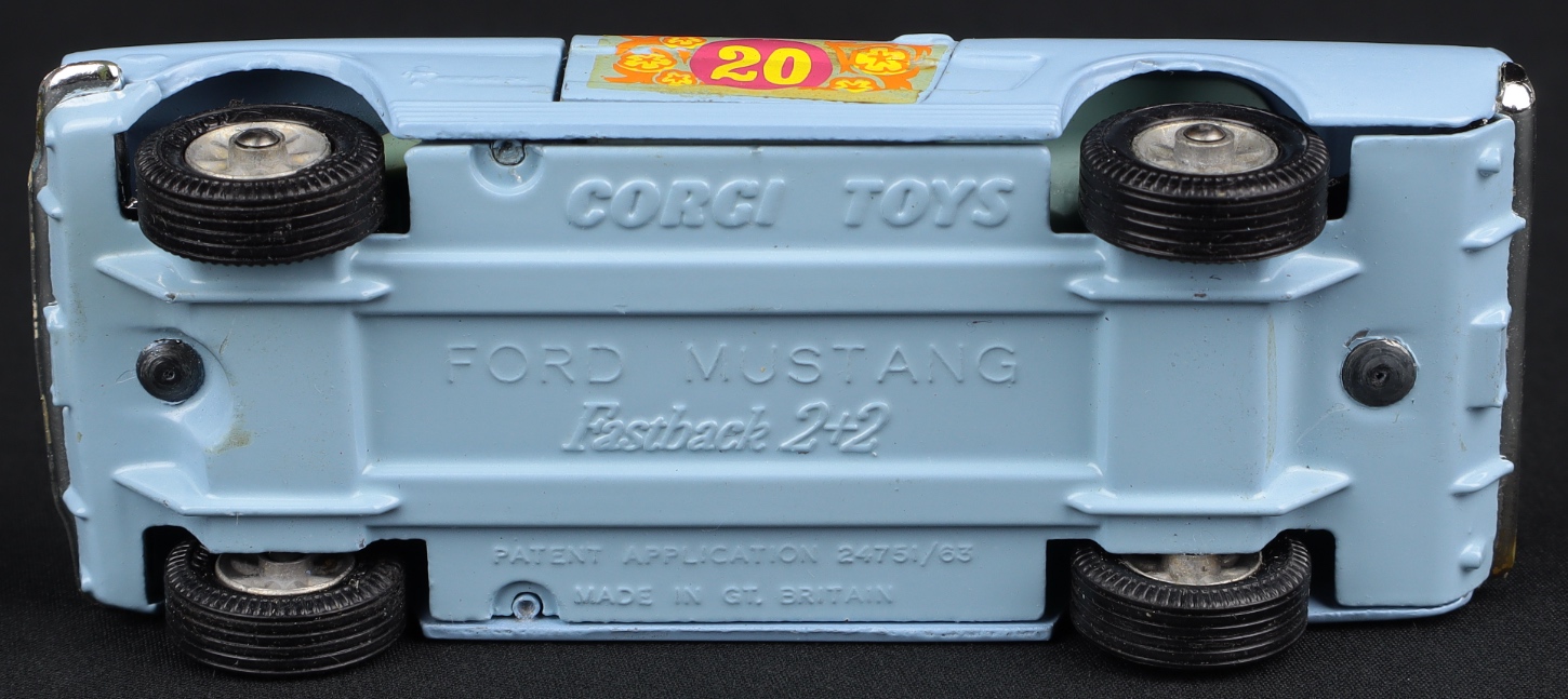 Issued 1968-69, with a pale blue finish and distinctive ‘Pop Art’ Flower Power labels throughout. Detailed cast wheels with suspension, and note this is a scarce find with the late issue nylon tyres with Corgi Toys embossed (issued at the end of the production run). Racing number 20. The bright ‘psychedelic’ labels are very nearly complete – complete. Jewelled headlights, opening doors and a perfect Mustang radiator grille label. Bright chrome bumper finish. Light blue interior.