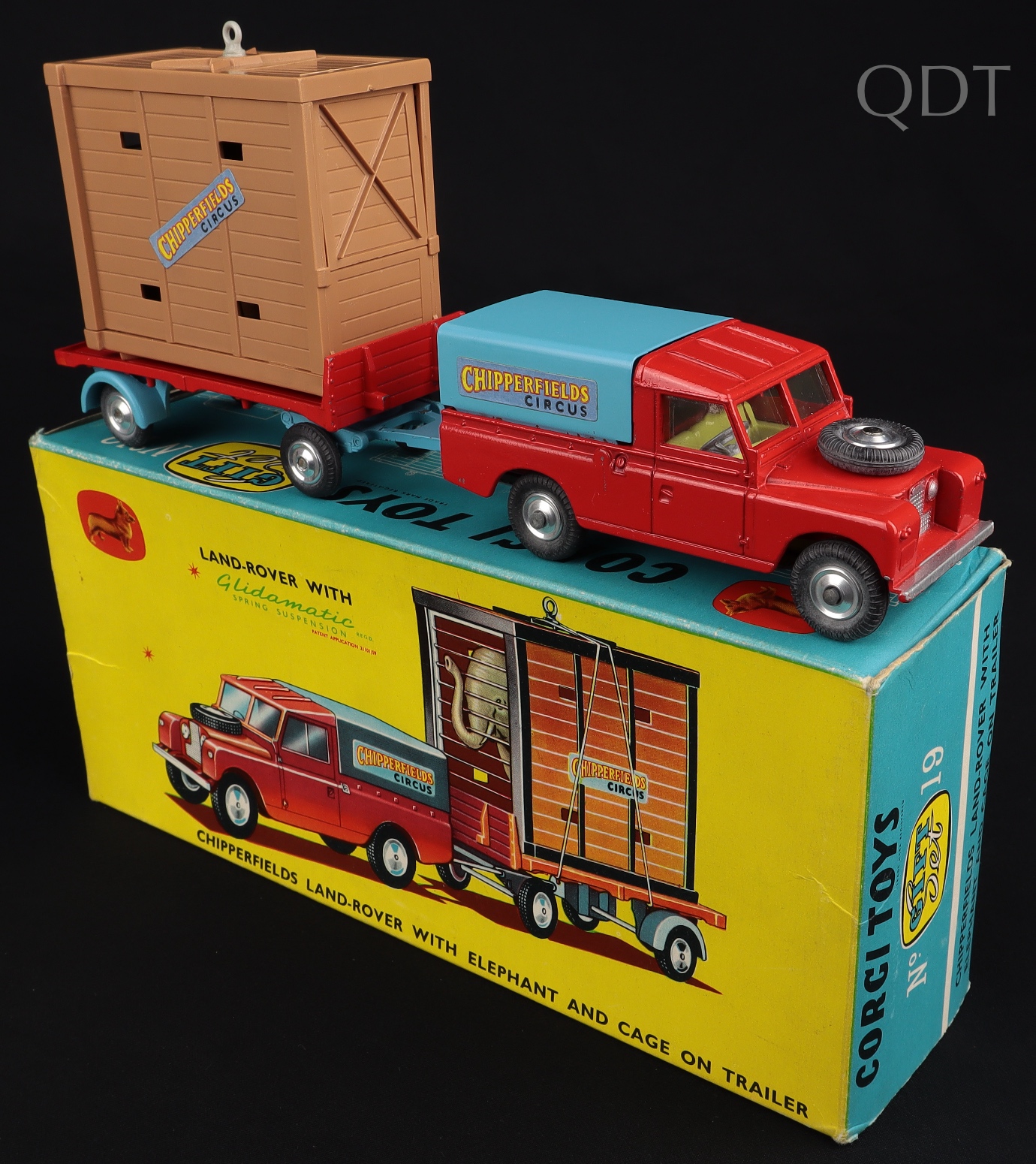 Chipperfields Land-Rover with Elephant & Cage on Trailer by Corgi Toys, Gift-Set, No. 19. Near mint plus - very near mint/boxed. Hard to find *1st issue* with tinplate tilt. With SCARCE EARLY wrap-around card packing. From The Elmer Collection.