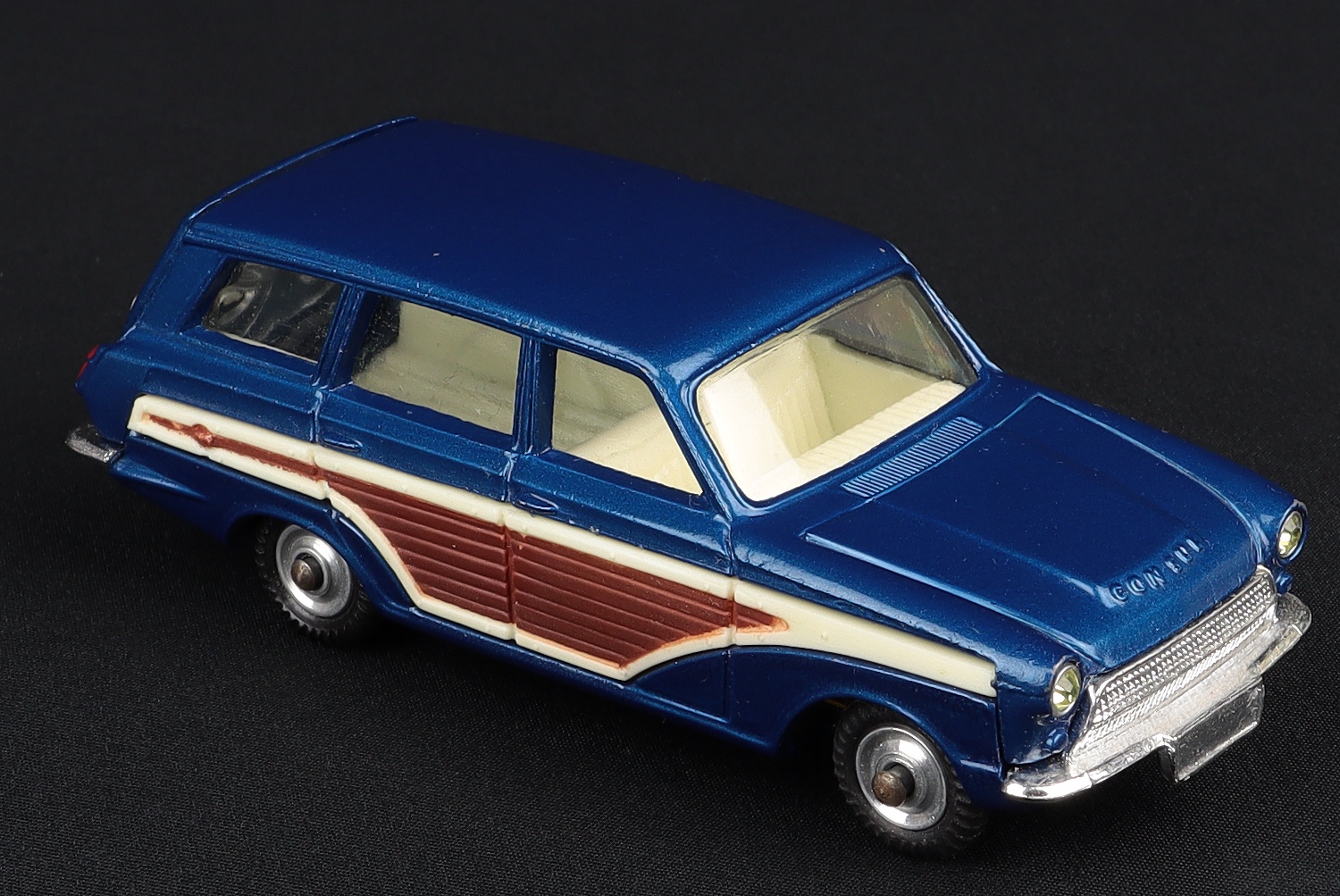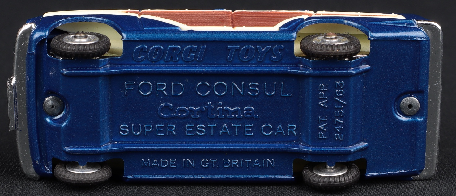 1) Corgi 491 Ford Consul Super Estate Car with “wood” side panels, suspension on bright shaped spun wheels, jewelled headlights, cream interior and opening tailgate. Bright chrome. Fine, well-shaped tyres.