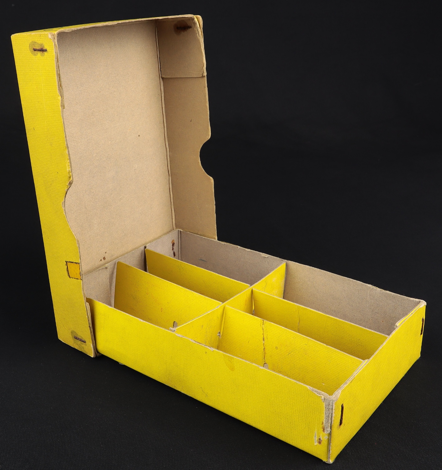 Bright yellow Dinky shopkeeper’s box would have originally housed 6 examples.Very light wear , remainder of the original tape which kept the lid closed. Nice to see the original card dividers are stil present: