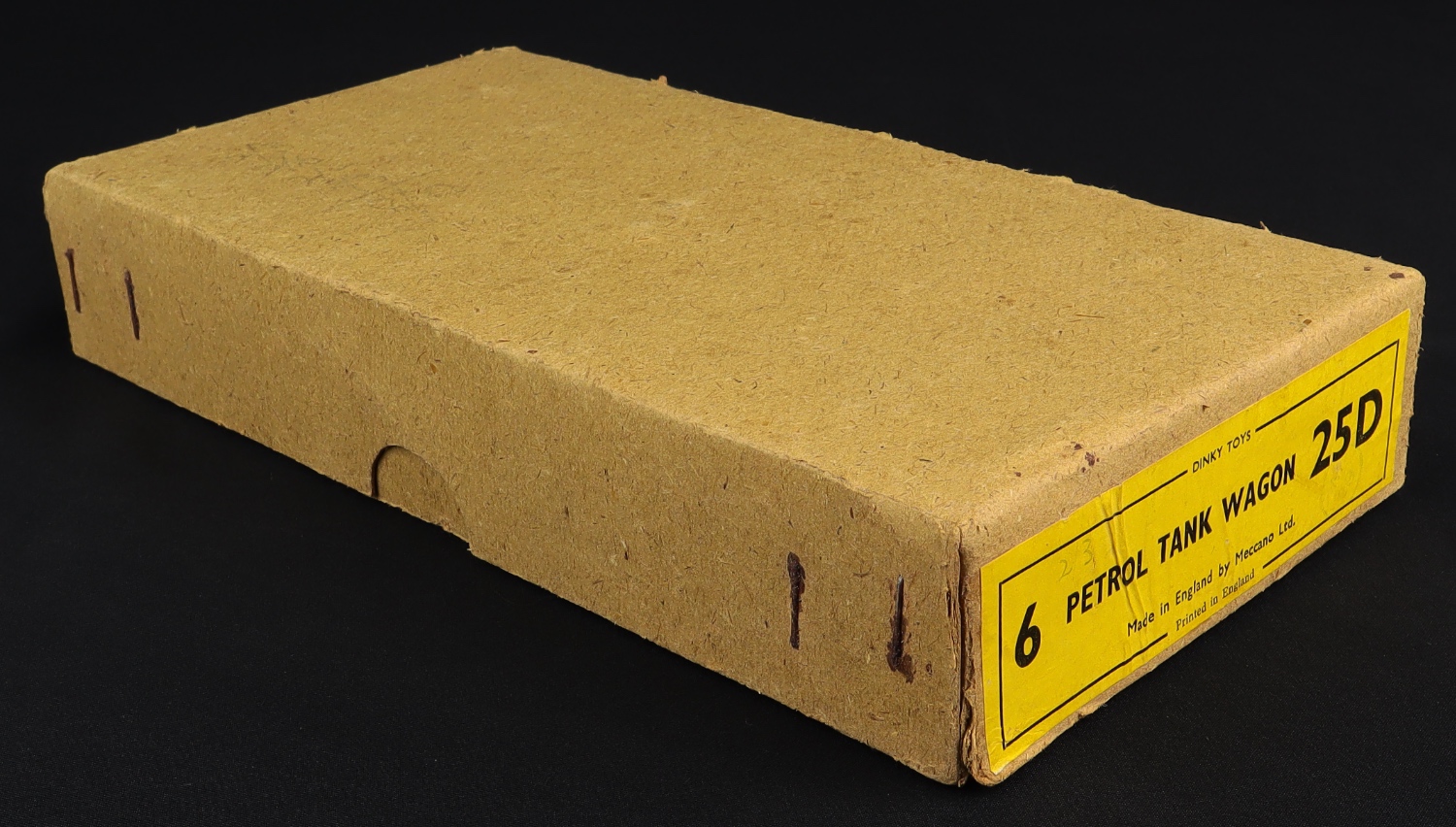 The plain buff Dinky Trade Box has original card dividers. Bright and complete yellow informative label on a short lid end. Little repair to a corner seam. Minor wear besides.