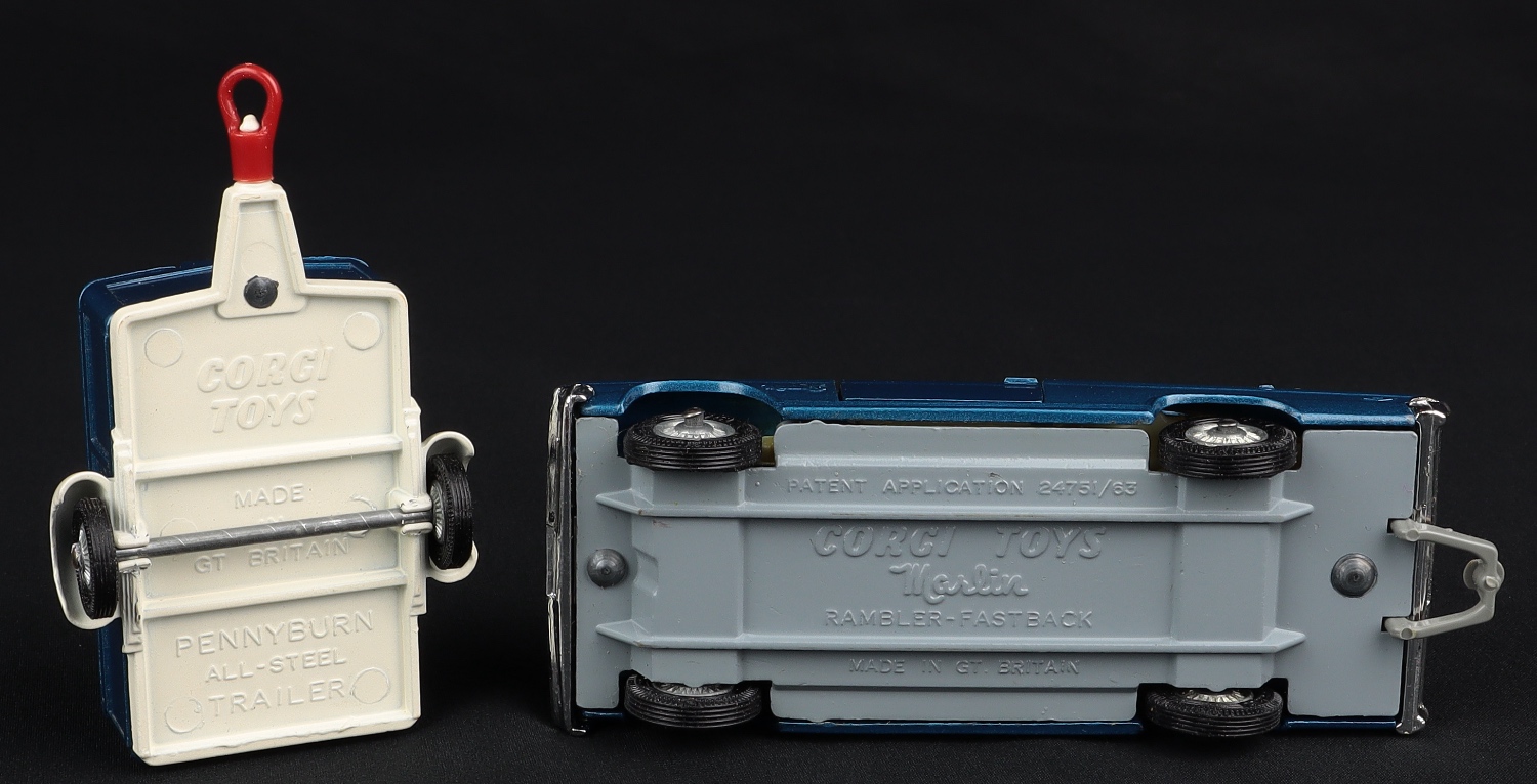 1) Corgi Marlin Rambler Sports Fastback in metallic mid-blue, white roof and boot, suspension on detailed cast wheels. Roof rack in place with red and white canoe atop. A scarce colour issue which only ever appeared in this gift set. Virtually mint condition with a notably intact grey tow bar.