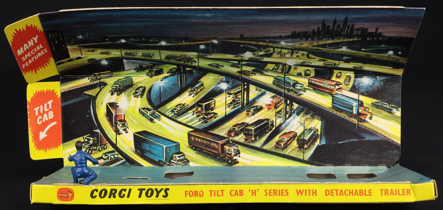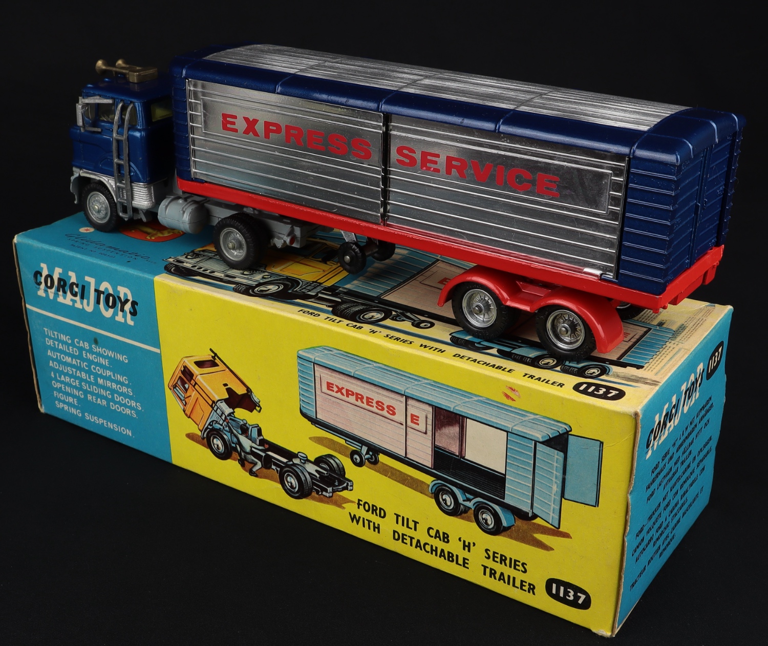 Ford Tilt Cab 'H' with Detachable Trailer "Express Service" by Corgi Toys, No. 1137. Cast wheels issue with GOLD roof horns. Very near mint/boxed. With mechanic and card packing piece.