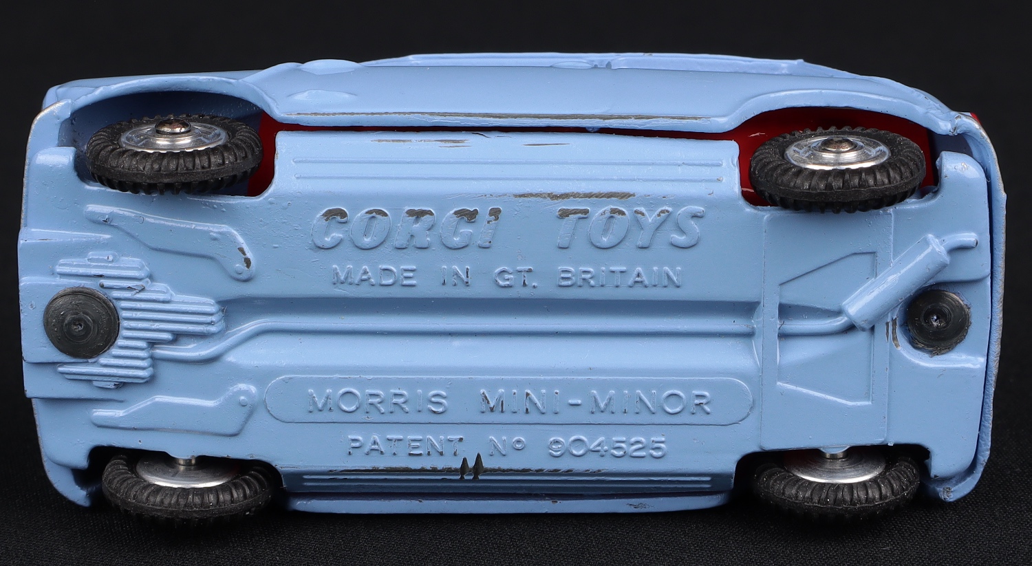 Morris Mini Minor by Corgi Toys, No. 266. Very near mint/boxed. Mid-blue issue with with shaped spun wheels & 'closed' axles. Scarce. From The Rickman Collection.