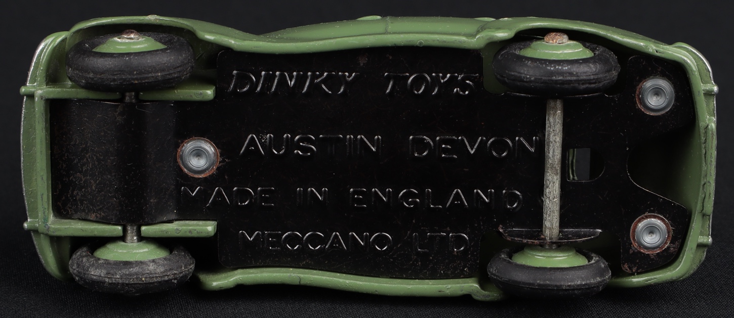 This fine classic car has a suede green finish with matching wheels, and large baseplate print. Well-shaped smooth original tyres. Devon cast on the underside of the roof.