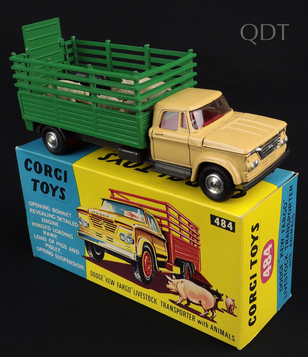 Dodge 'Kew Fargo' Livestock Transporter with Animals by Corgi Toys, No. 484. Spun wheels. Very near mint/boxed. With five pigs/piglets in 'straw' card base. From The Elmer Collection.