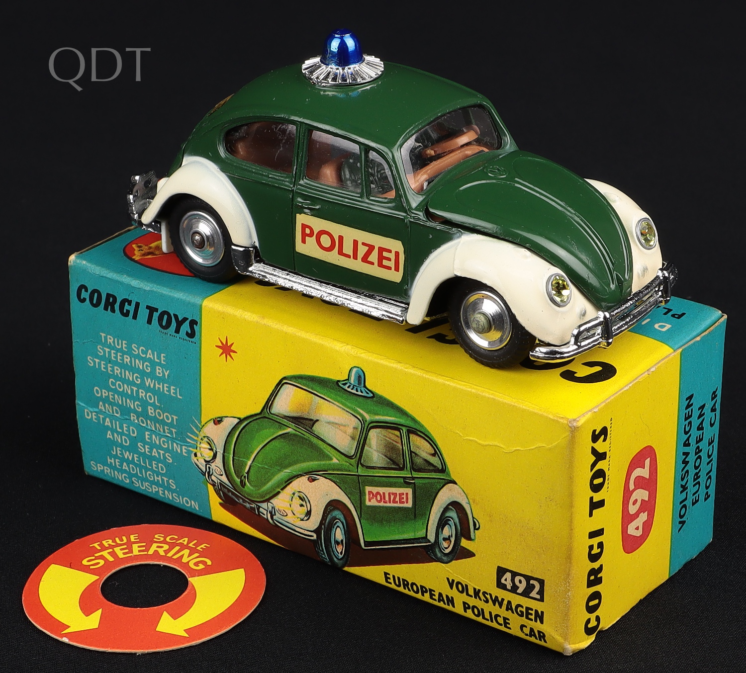 Fresh deep green and white finish, bright chrome roof light surround, bumpers and base. Blue light and steering mechanism on the roof.