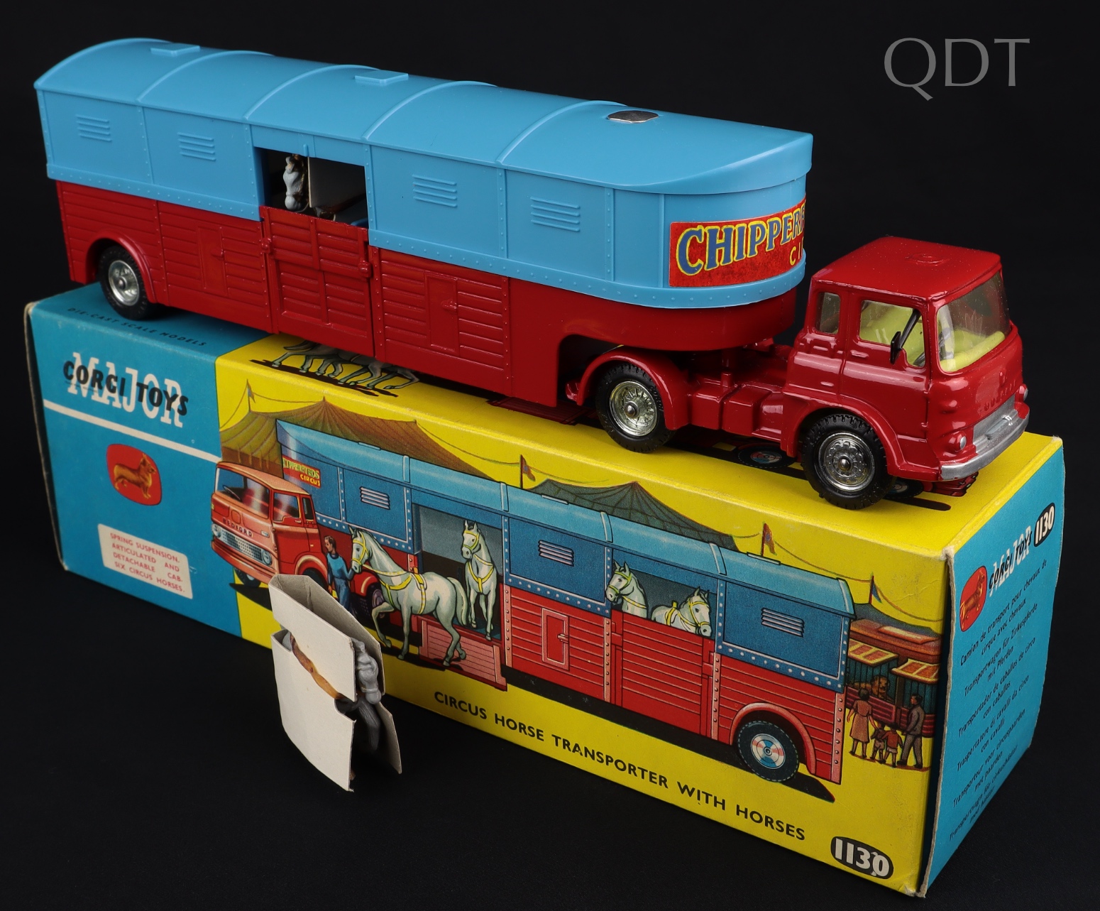 Circus Horse Transporter with Horses by Corgi Toys, No. 1130. Very, very near mint/boxed. Scarce with cast wheels! With six grey horses & individual wrap-around card packing. Card packing piece sleeve. Starting bid £250. Please note that QDT apply 12.5% buyer's commission.
