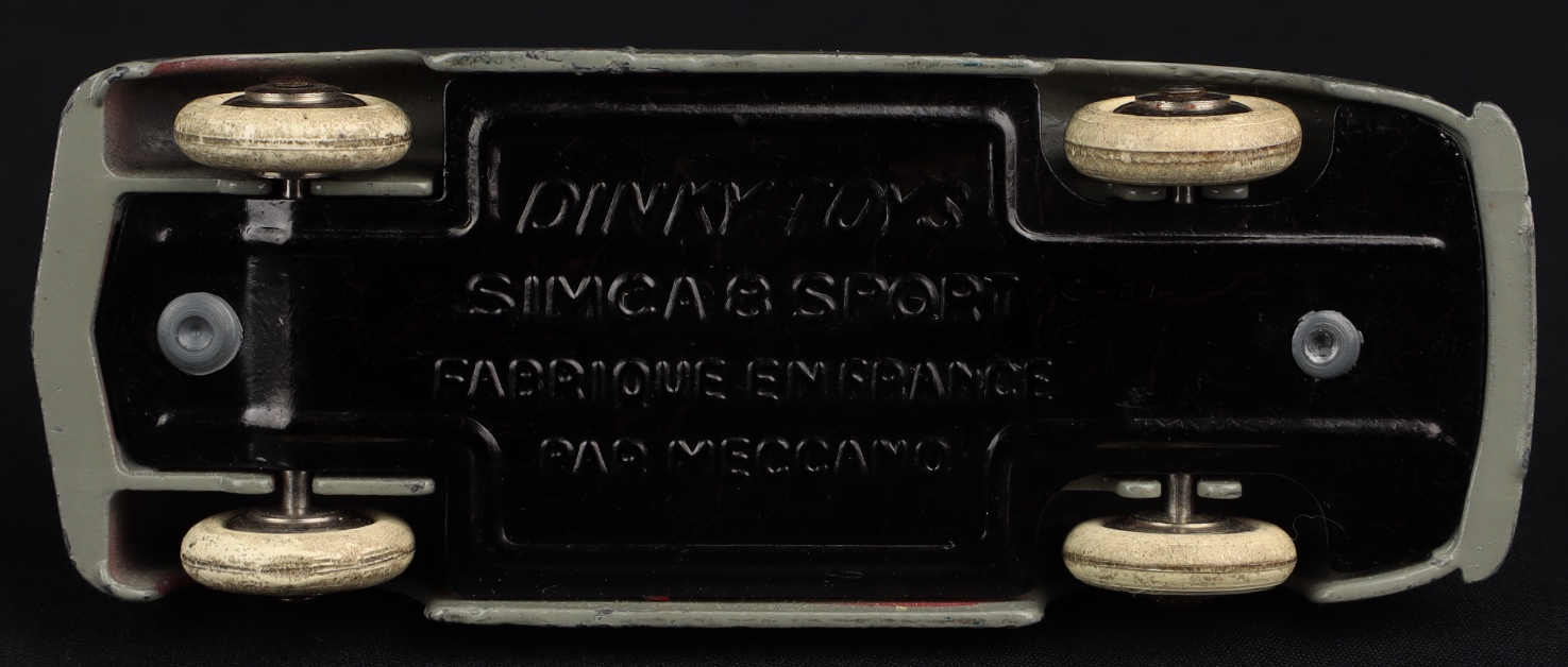 This 2nd type Simca (with thick windscreen) is finished in mid-grey with a bright red matt interior, cream steering wheel, generally shiny convex wheels, and smooth white tyres (a little age grubbiness and a flat spot). Shiny baseplate. The first we have offered for sale in a long while.