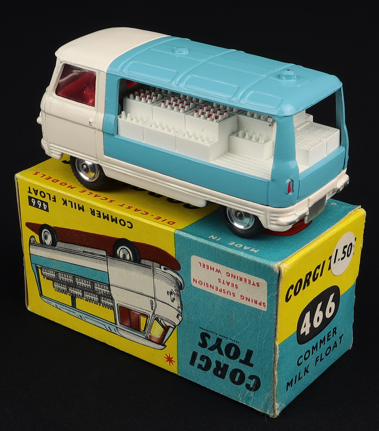 A popular Corgi model, this Commer Milk Float has an all original blue and white finish, with milk load and shaped spun wheels with suspension. Fine tread original tyres are well-shaped.