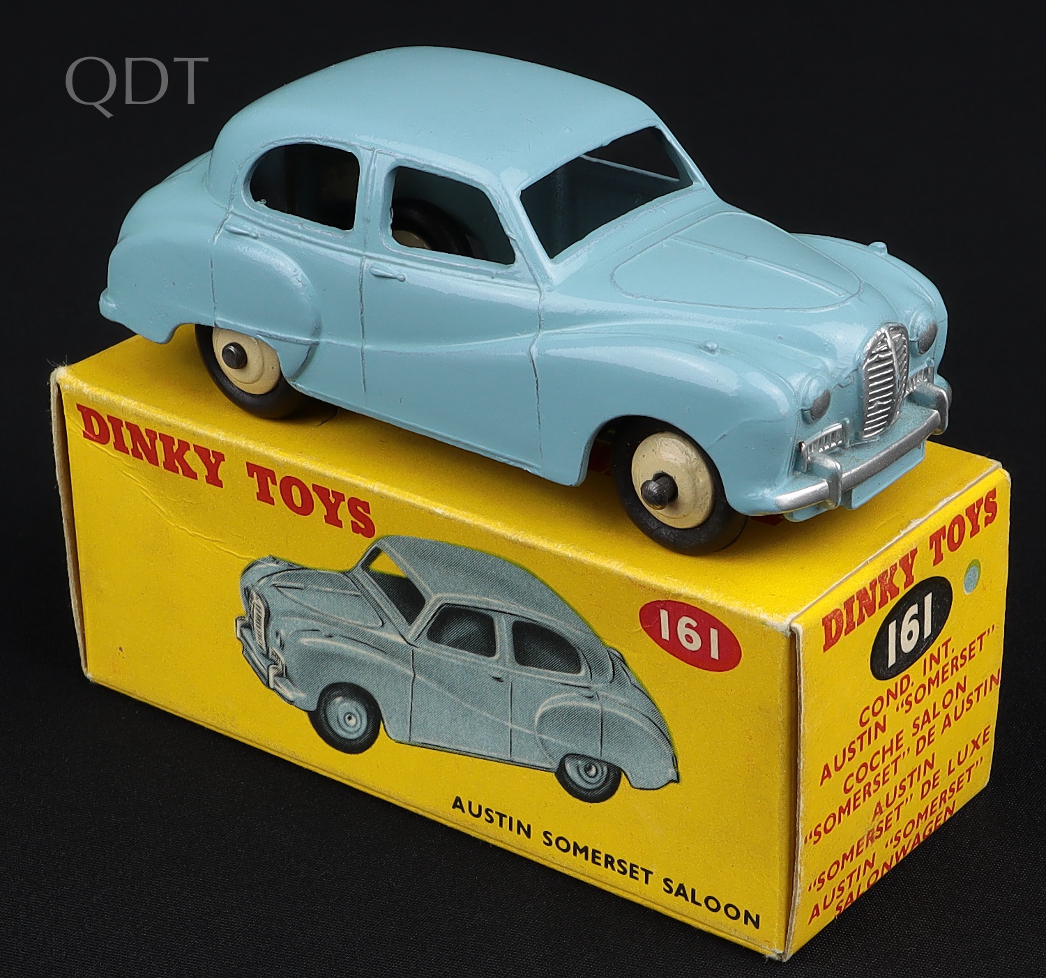 Austin Somerset Saloon by Dinky Toys, No. 161. Light blue issue with CREAM wheels. Very near mint/boxed. QDT starting bid £400. Please note that QDT apply 12.5% buyer's commission.