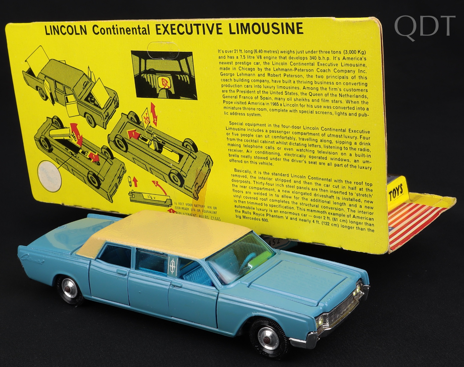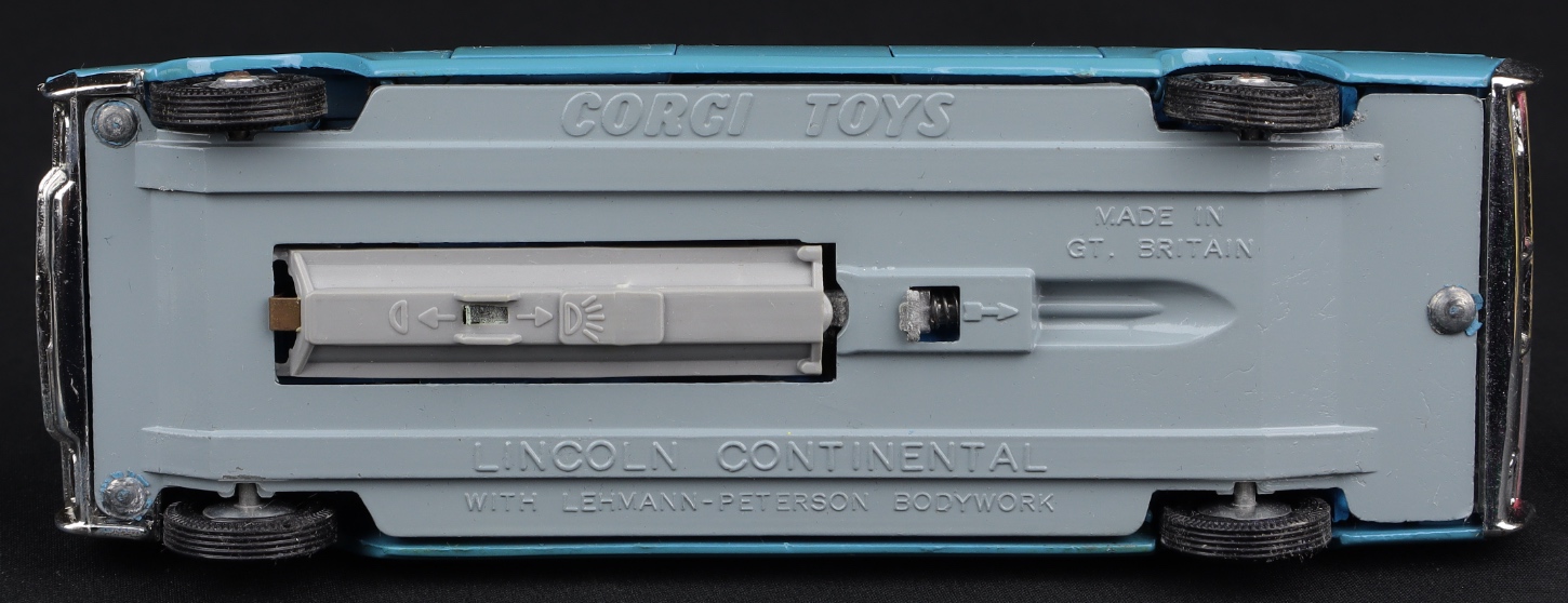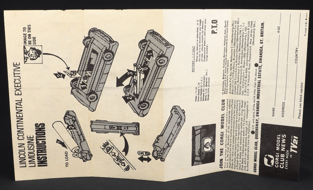 Lincoln Continental Executive Limousine by Corgi Toys, No. 262. Very near mint/boxed. Scarce BLUE AND FAWN version! Complete picture strip & model specific leaflet/Corgi Club Membership Form. 2 original packing card pieces. Cream of the crop from The Mark Mulvale Collection!
