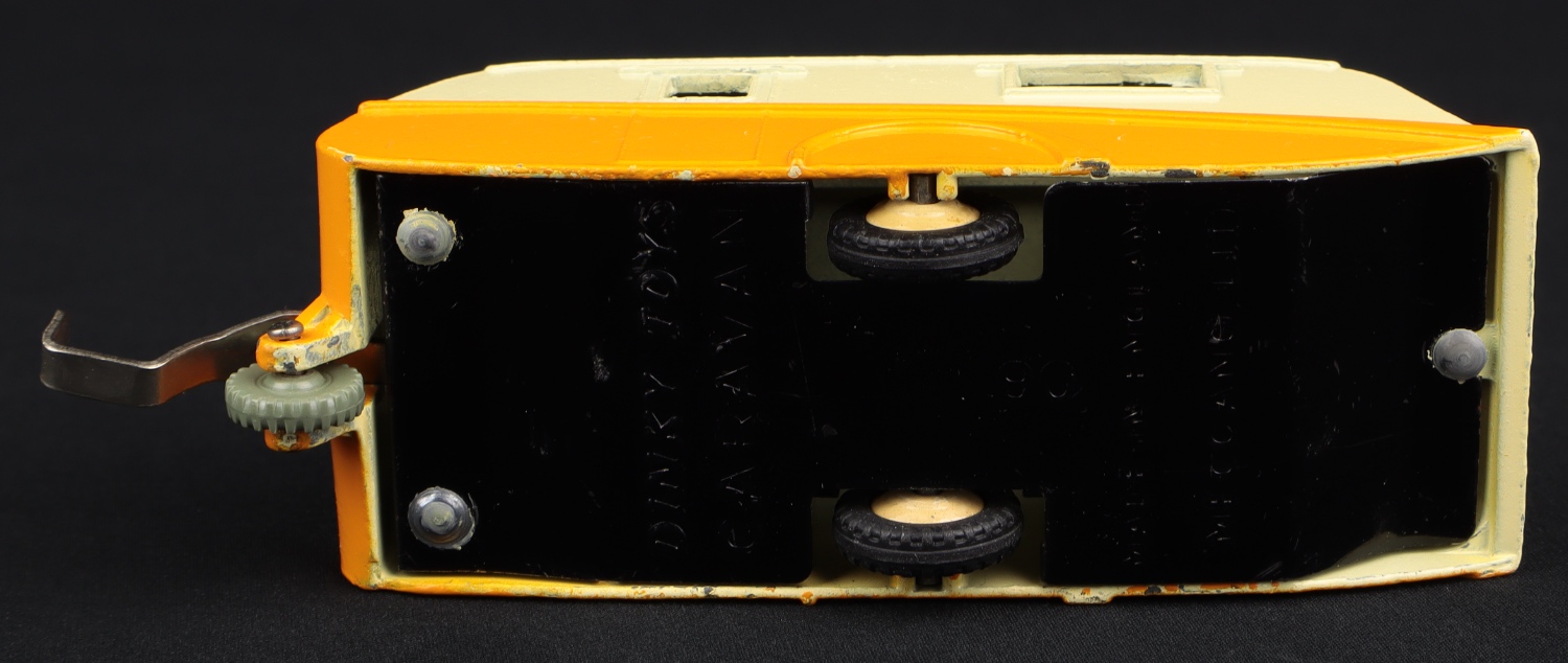 The Caravan is a fine example in deep yellow and cream finish, fawn wheels. Drawbar and smooth grey plastic jockey wheel. Made between 1962-64.