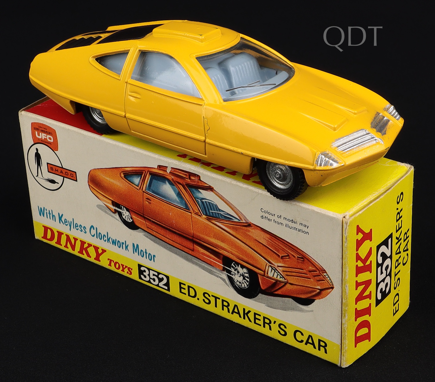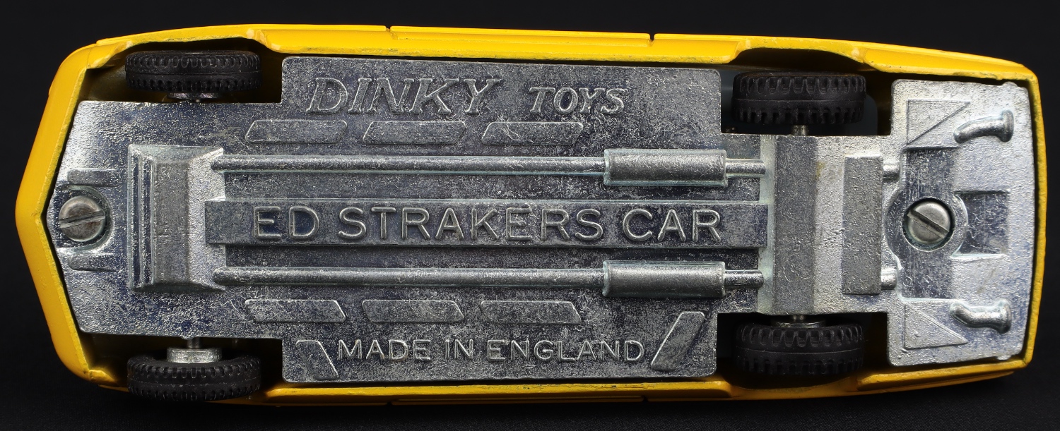 Ed. Straker's Car by Dinky Toys No. 352. In DEEP YELLOW with GREY-BLUE INTERIOR. SILVER BASE. Very near mint/boxed. Includes Instruction Leaflet. From The Eccles Collection.