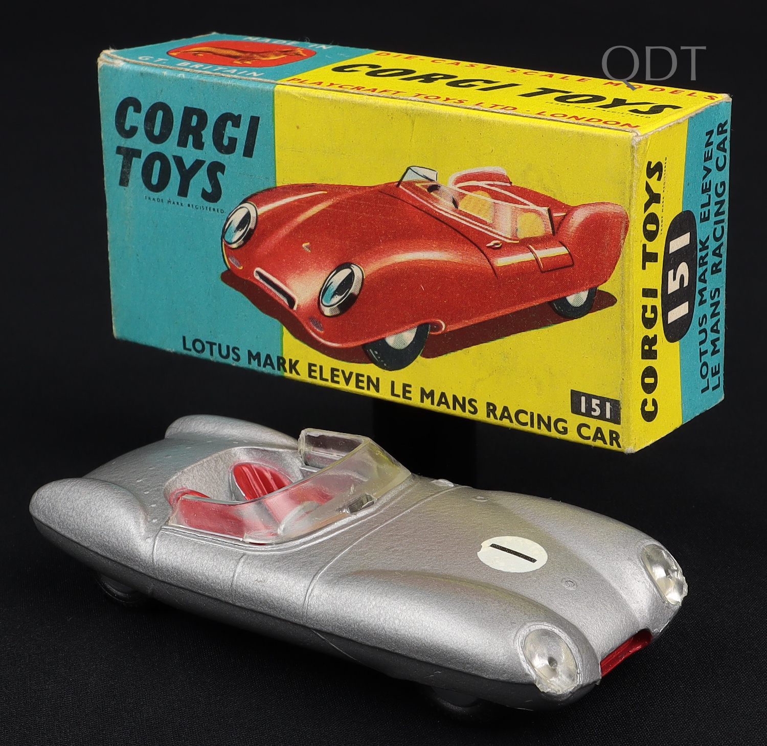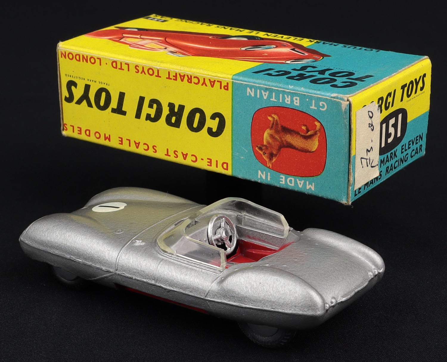 Lotus Mark Eleven Le Mans Racing Car by Corgi Toys, No. 151. Silver with Racing No. 1. Scarce. Very, very near mint/boxed. From The Elmer Collection.