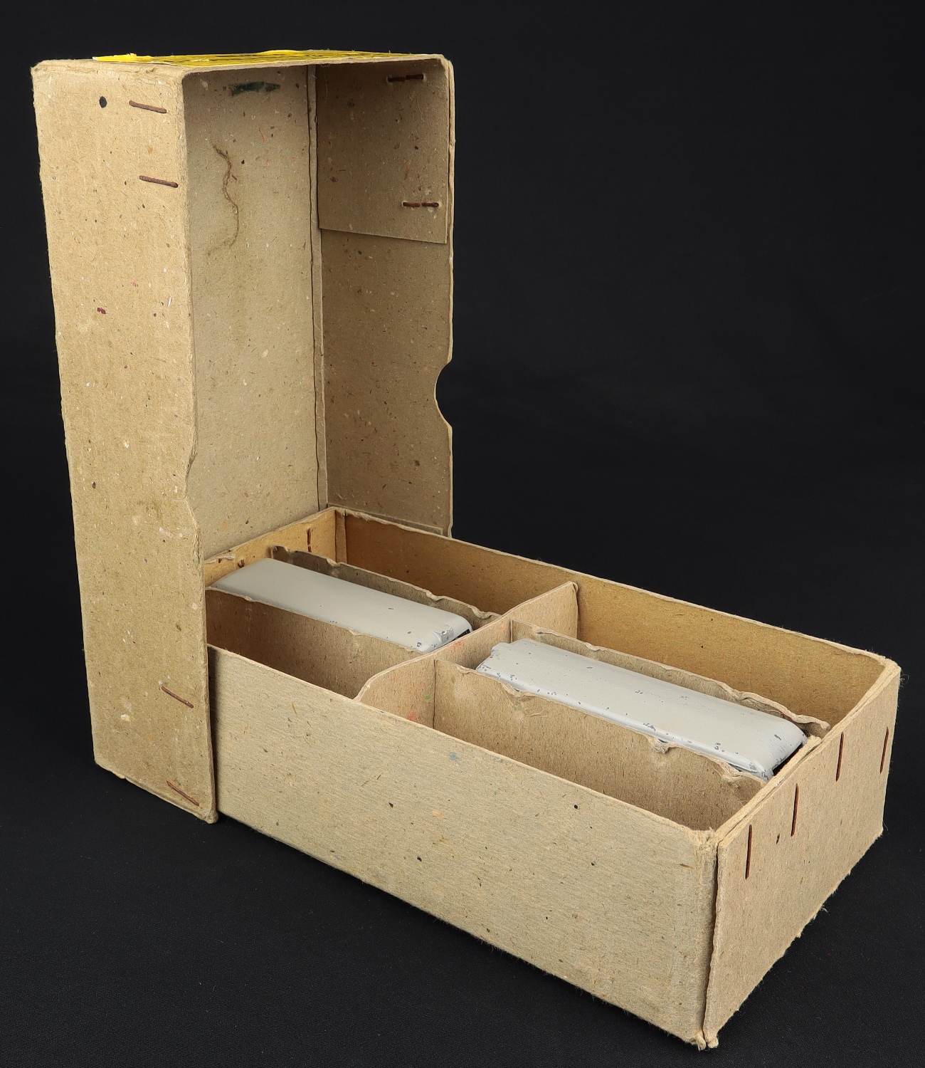 Sturdy buff Dinky Trade Box presents well, showing light wear. No seam tears or repairs. Light scuff/wear. Virtually complete bright deep yellow informative label ar a lid end. Original card dividers.