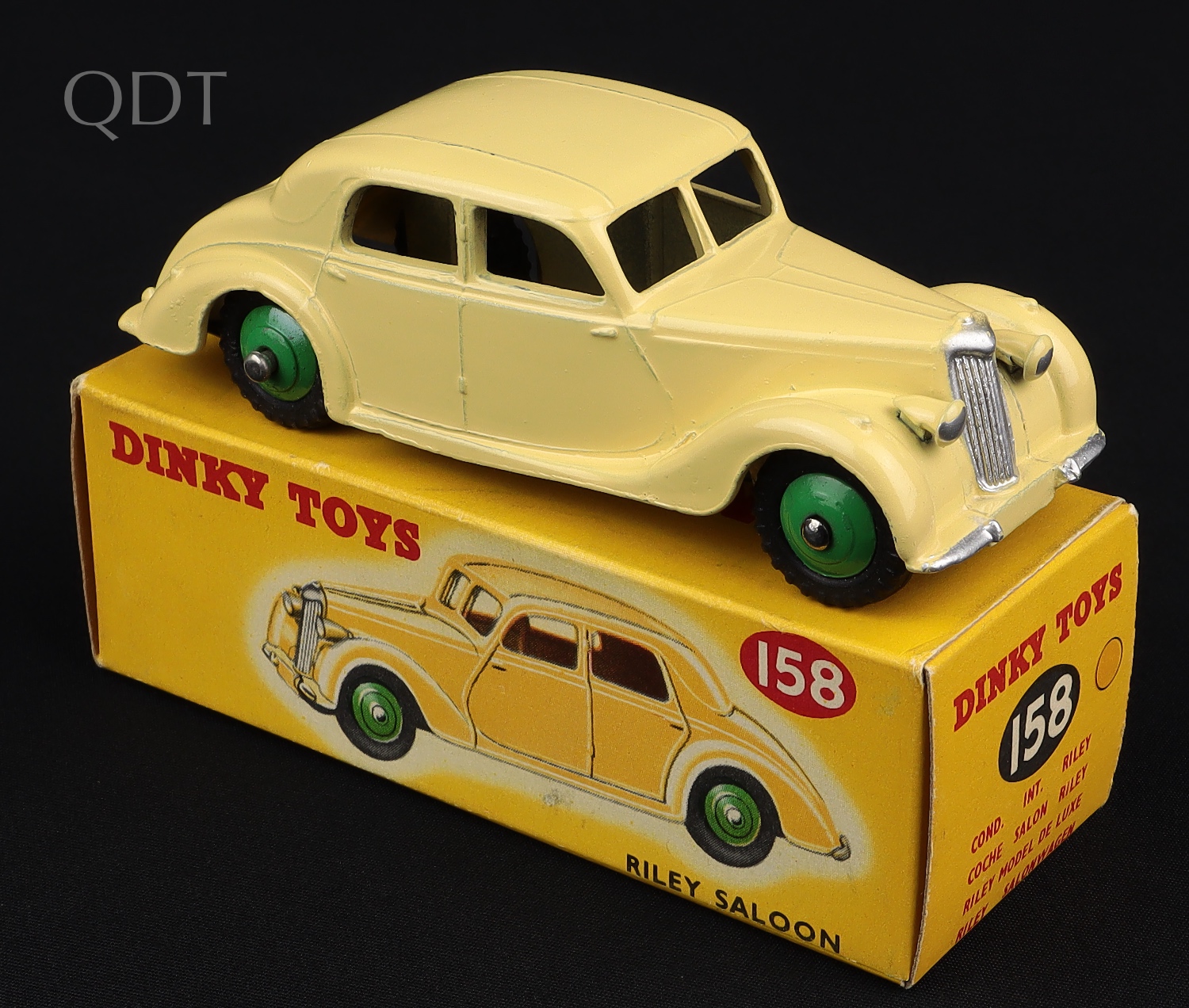 Riley Saloon by Dinky Toys, No. 158. Cream with green wheels, treaded tyres version. Very near mint/boxed. From The Dutch-Hillman Collection.
