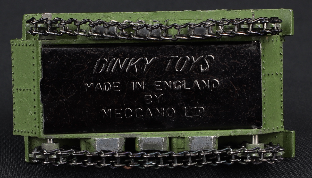 This is a very fine example of a rare military item made by Dinky in Great Britain for export to the USA, just post war. In all original condition, this Light Tank has a black base and chains and a green painted aerial.