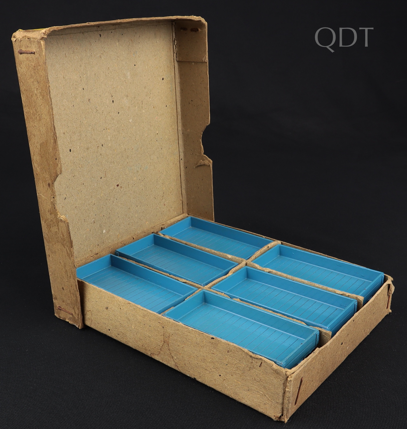 6 x Garden Trucks in original Trade Box, Dinky Toys No. 105C. Near mint plus - very near mint. With original card dividers. Scarce old shop stock item from The Reference Collection. Starting bid £150. Please note that QDT apply 12.5% buyer's commission.