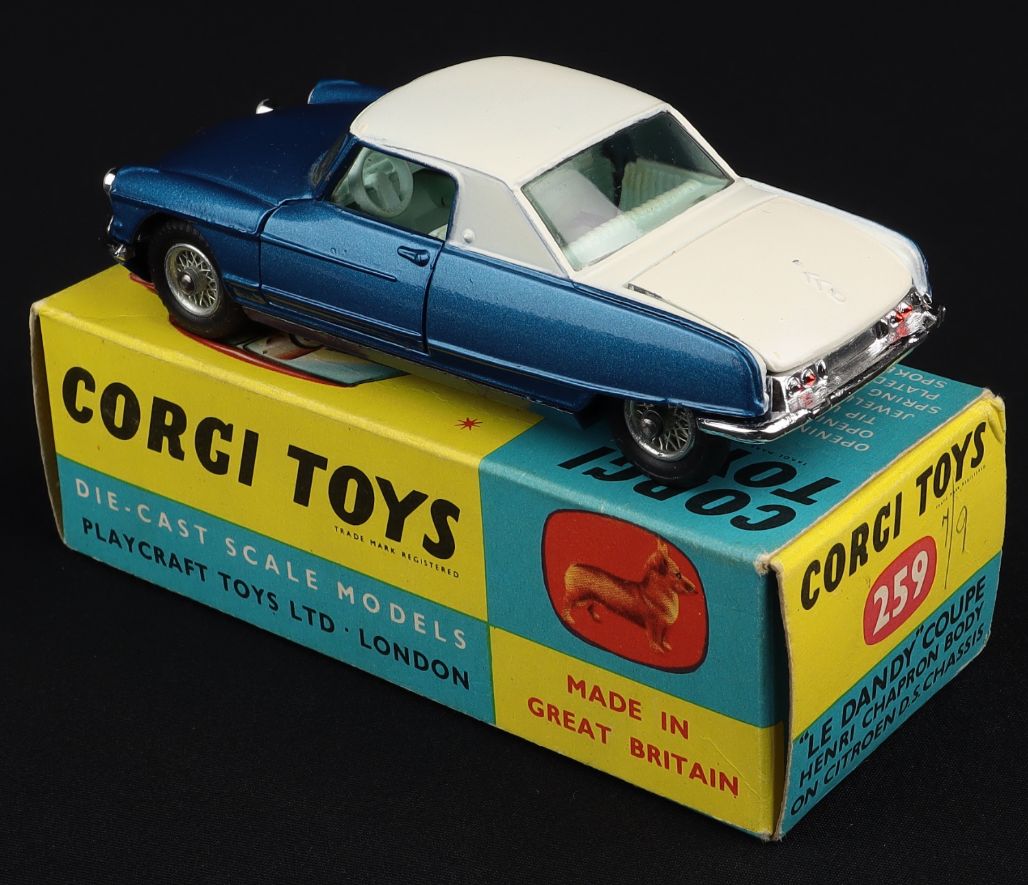 Citroen "Le Dandy" Coupe by Corgi Toys, No. 259. Very near mint/boxed. Scarce issue in metallic blue & white. From The Eccles Collection.