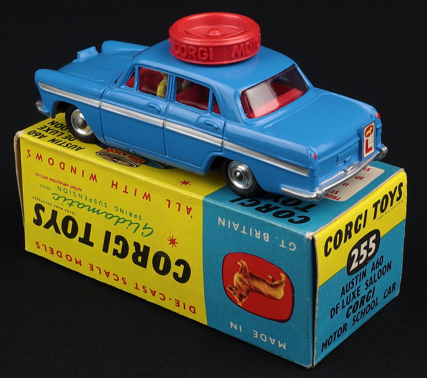 Austin A60 Motor School Car by Corgi Toys, No. 255. Scarce export left-hand drive issue. With Leaflet. Very, very near mint/boxed, correct L.H. Drive print on box. From The Eccles Collection.