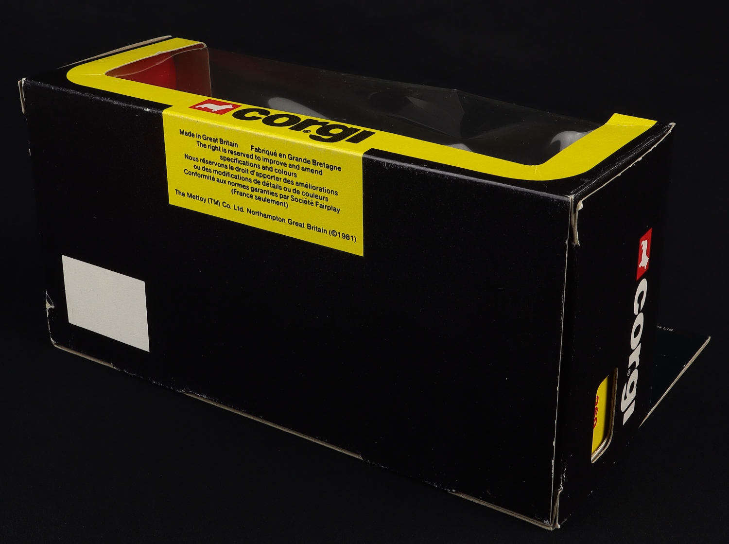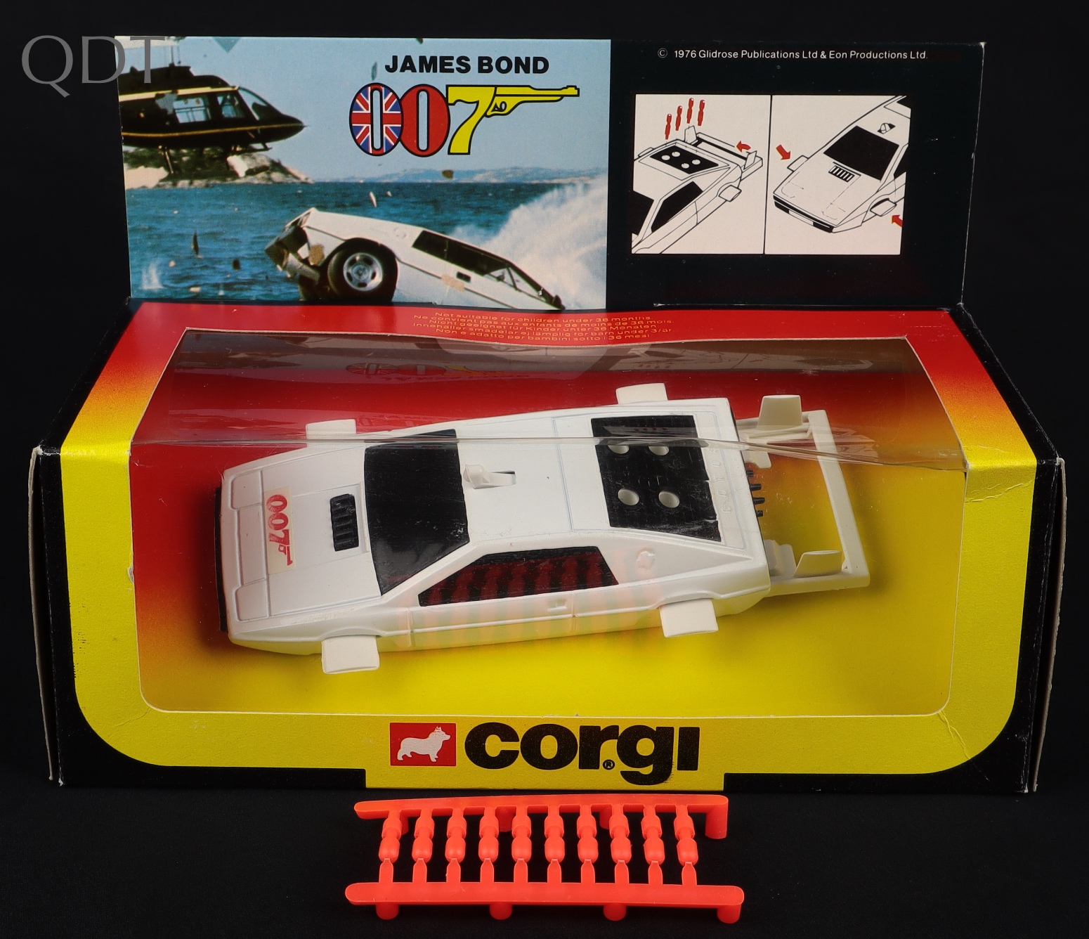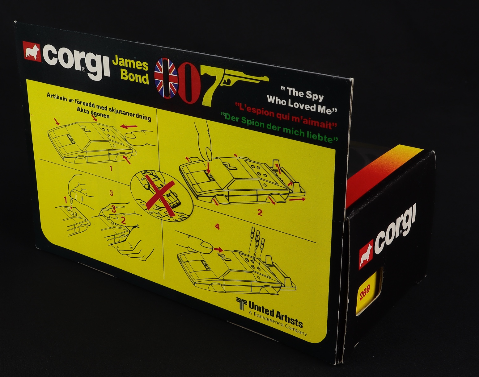 James Bond Lotus Esprit by Corgi Toys, No. 269. Rare late detachable header card version with multi-lingual 'Not suitable for children under 36 months' print. Very near mint/boxed. From The Off-shore Collection.