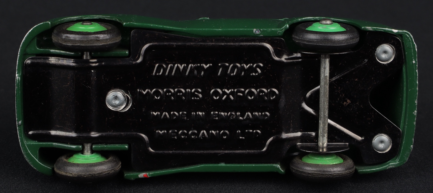 A lustrous very dark green paint finish on this early Dinky car with 1st type baseplate (small print and chassis rails). Mid-green wheels. Bright baseplate and axles.