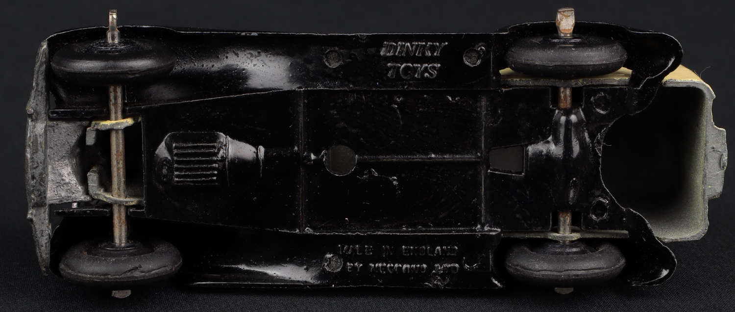 Very close to mint cream and black finish with bright red cross details on both sides. This all original early Dinky ambulance has a close to perfect cream and black finish with bright red cross details on both sides. This version has filled-in rear side windows. Complete headlight and radiator assembly, black ridged wheels, smooth tyres (no flat spots) and crimped axles.