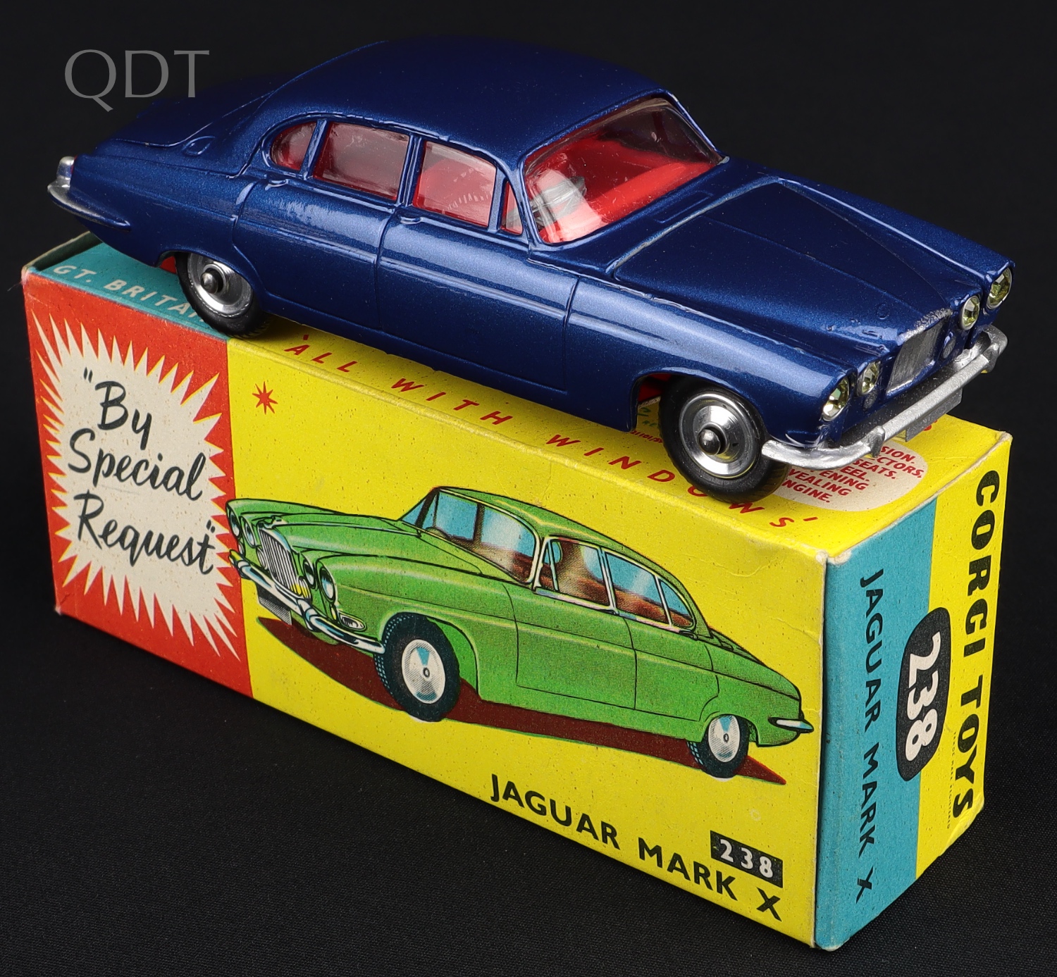 Jaguar Mark X by Corgi Toys, No. 238. Scarce deep metallic blue issue with a red interior. Very near mint/boxed. With both suitcases. Scarce model from The Eccles Collection. QDT starting bid £250. Please note that QDT apply 12.5 % buyer's commission.