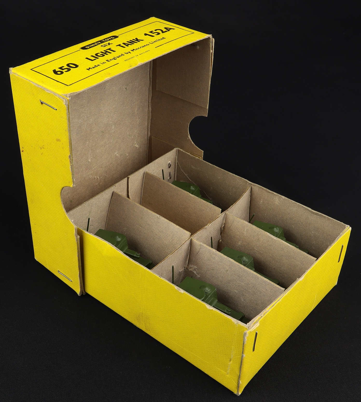 Light Tank x 5 by Dinky Toys, No. 152A in original Dinky Trade Box, with card dividers. Military green. Black base. Export version. Very near mint - very , very near mint. Scarce military item. Old shop stock from The Off-shore Collection. QDT starting bid £300. Please note that QDT apply 12.5% buyer's commission.
