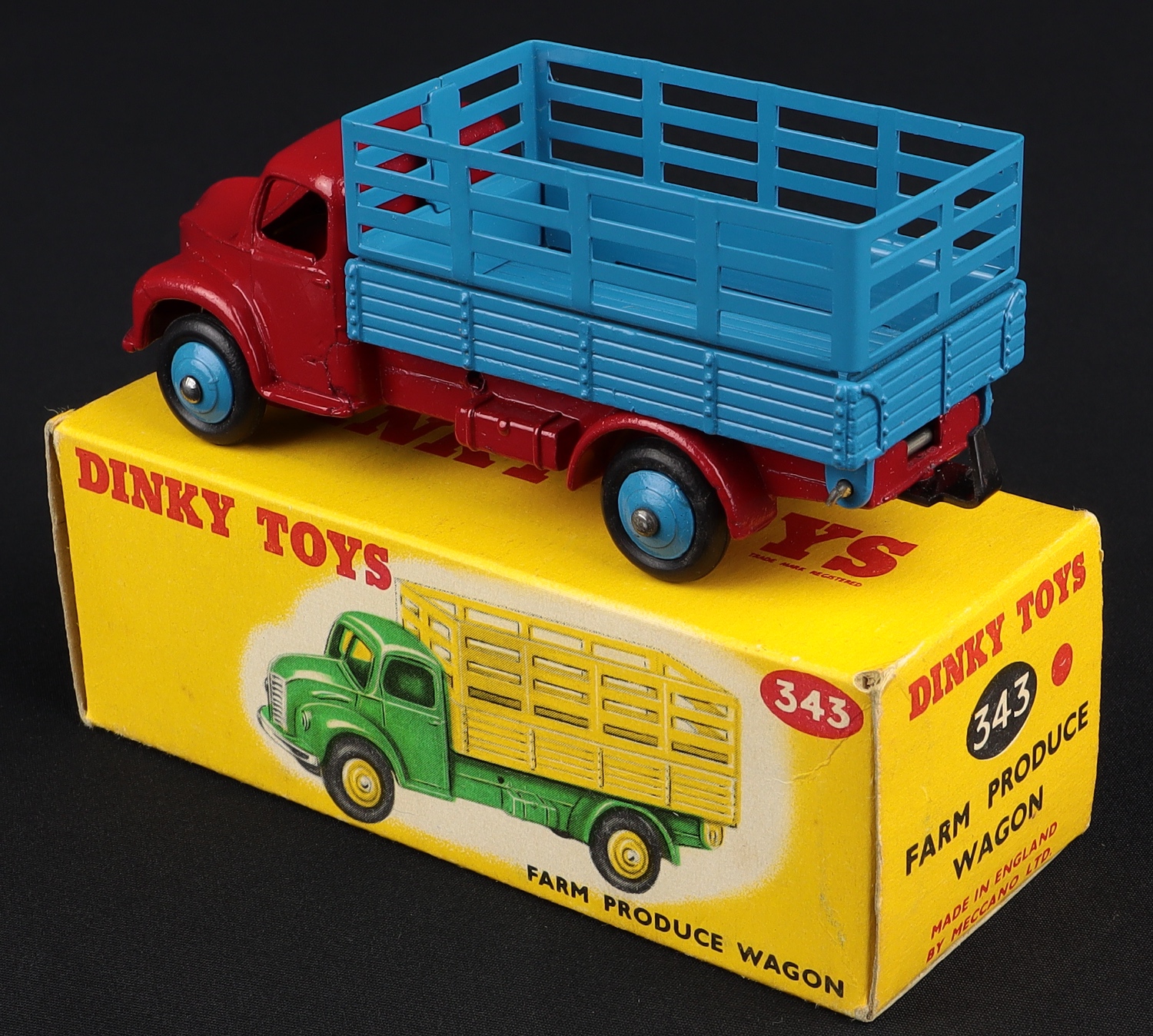 Farm Produce Wagon by Dinky Toys, No. 343. Very, very near mint/boxed. Cherry red and mid blue version. From The Off-Shore Collection.