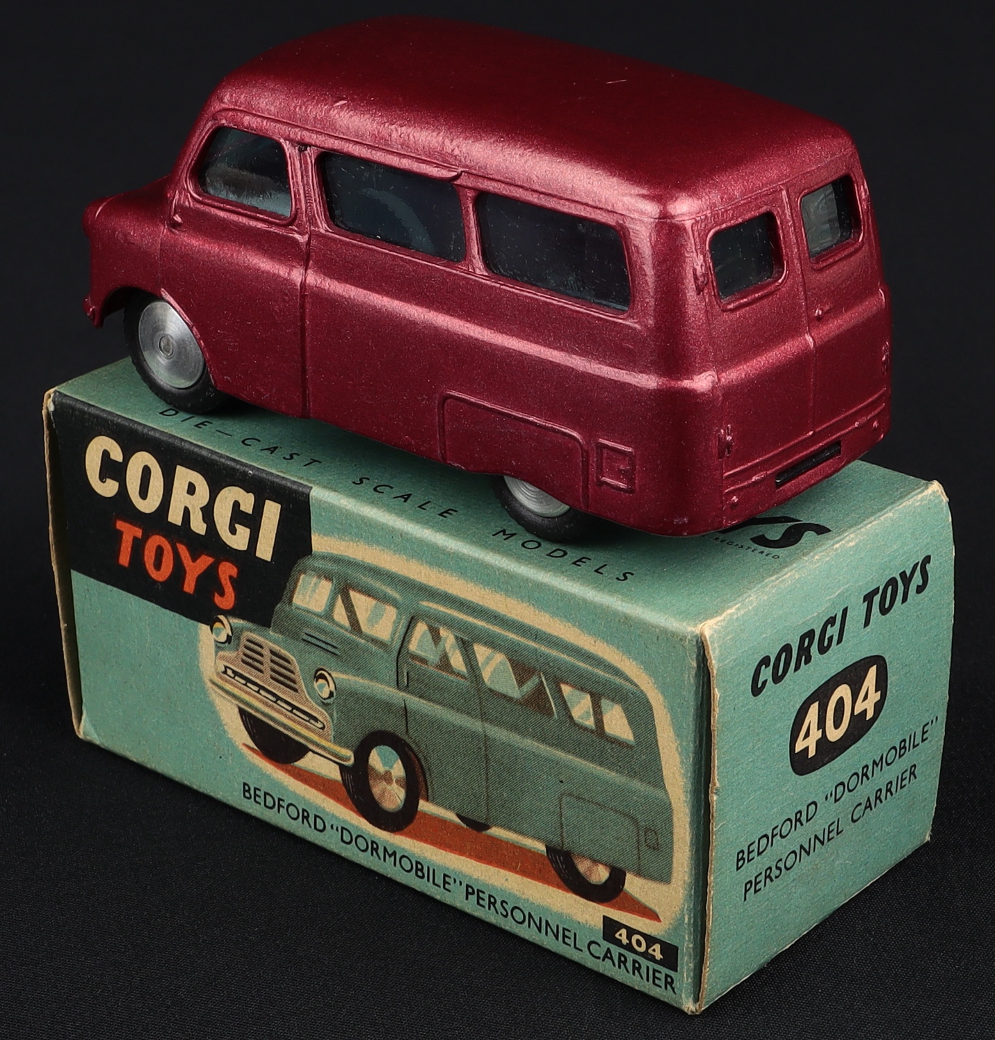 Bedford "Dormobile" Personnel Carrier by Corgi Toys, No. 404. Metallic deep cerise version. Very near mint/boxed, with booklet & pink Corgi Club Membership Form. Scarce. From The Dutch-Hillman Collection.