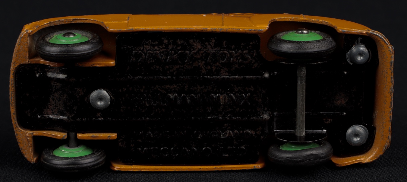 A harder to find variation of this classic Dinky model finished in vibrant tan or butterscotch finish with green ridged wheels. Small print on a somewhat tarnished baseplate with no number stamped.