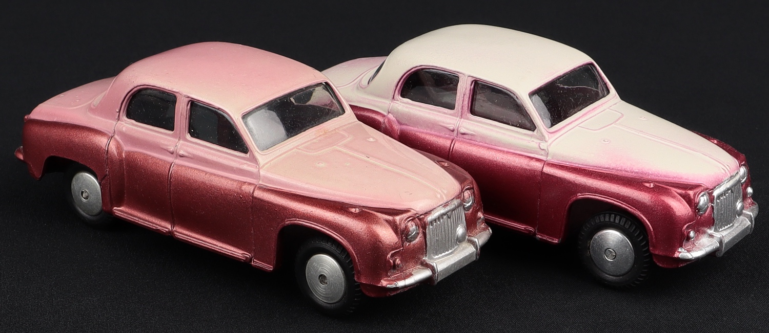 Rover 90 Saloon by Corgi Toys. No. 204. Later two-tone issue in METALLIC BURNISHED CORAL & PINK-CREAM flat spun wheels. Very, very near mint/boxed. So scarce! From The Eccles Collection. Starting bid £250. Please note that QDT apply 12.5% buyer's commission.