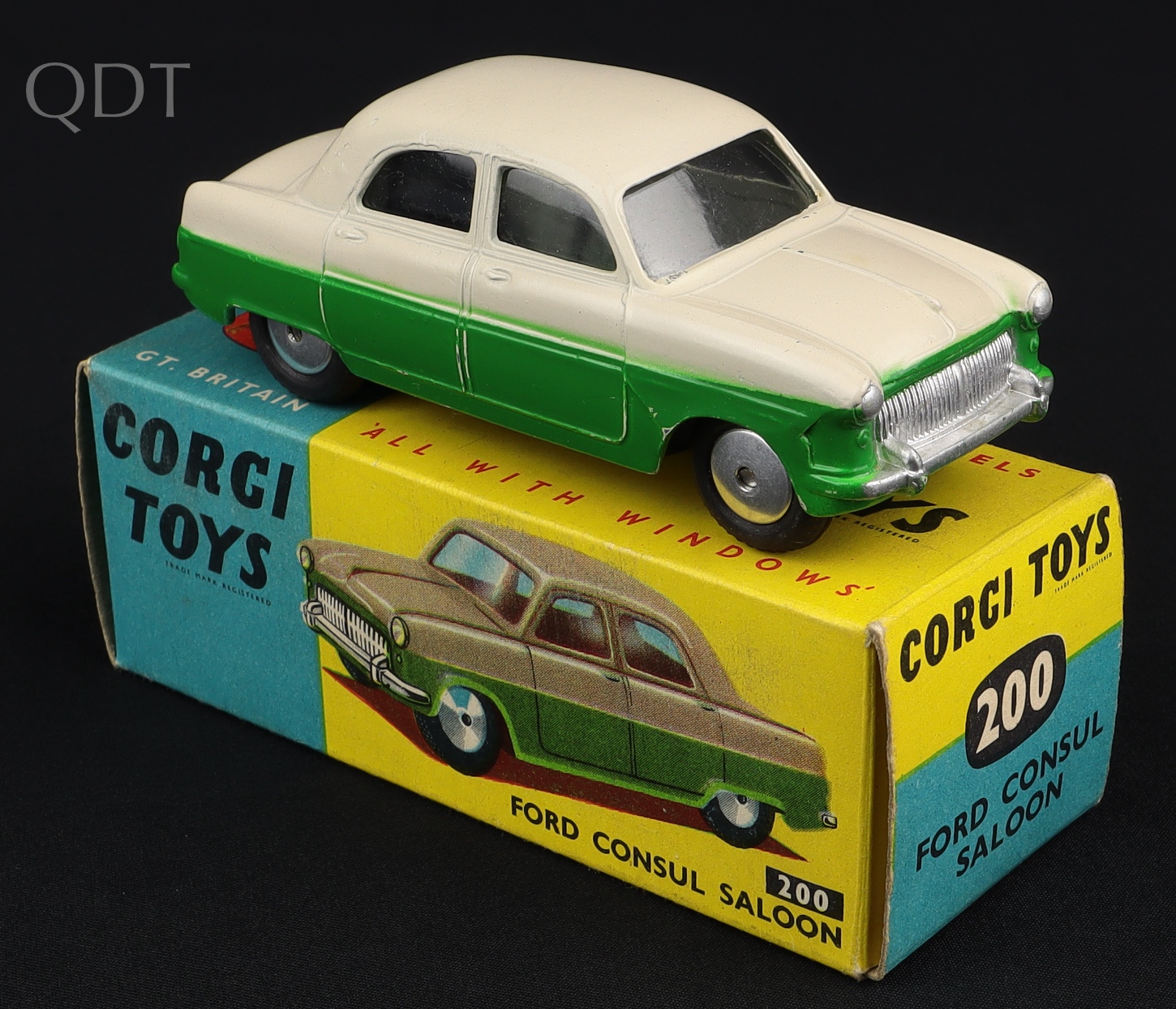 Ford Consul Saloon by Corgi Toys, No. 200. Near mint plus/boxed. Scarce two colour issue in GLOSS OYSTER over mid-green. From The Eccles Collection.