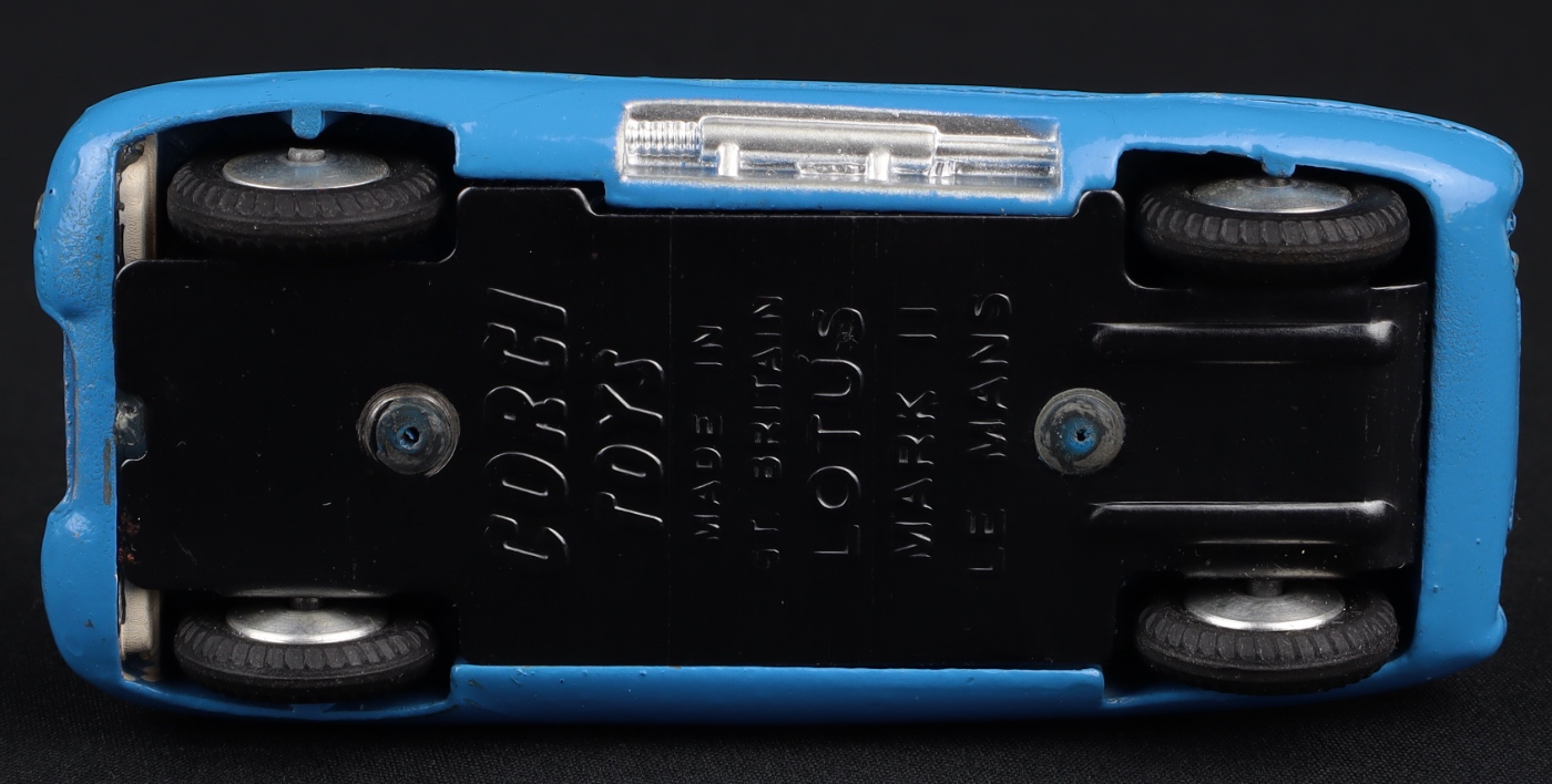 A sought-after Corgi model issued 1961-65 under this numbering. Eye-catching bright mid-blue finish, intact red and white bonnet stripe, white driver, racing number 7, shiny flat spun hubs. Fine original tyres.