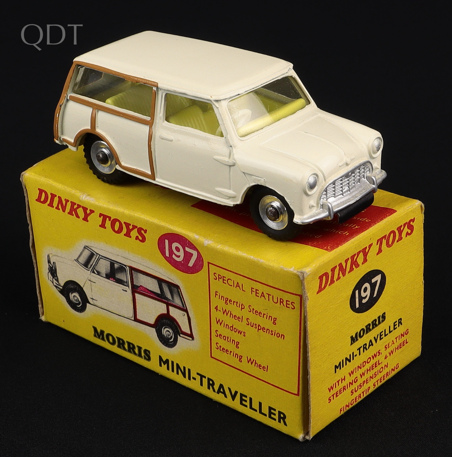 Morris Mini-Traveller by Dinky Toys, No. 197. Very, very near mint/boxed. Ivory version, with Morris grille, lemon interior, brown woodwork. Matte base. Scarce! Starting bid £300. Please note that QDT apply 12.5% buyer's commission.