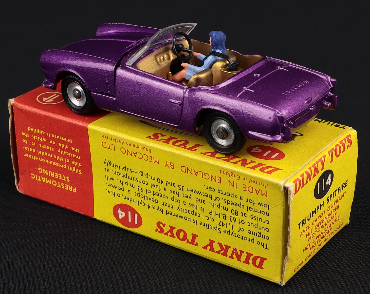 Triumph Spitfire by Dinky Toys, No. 114. Very near mint/boxed, with card packing ring. Scarce metallic purple version from The Eccles Collection.