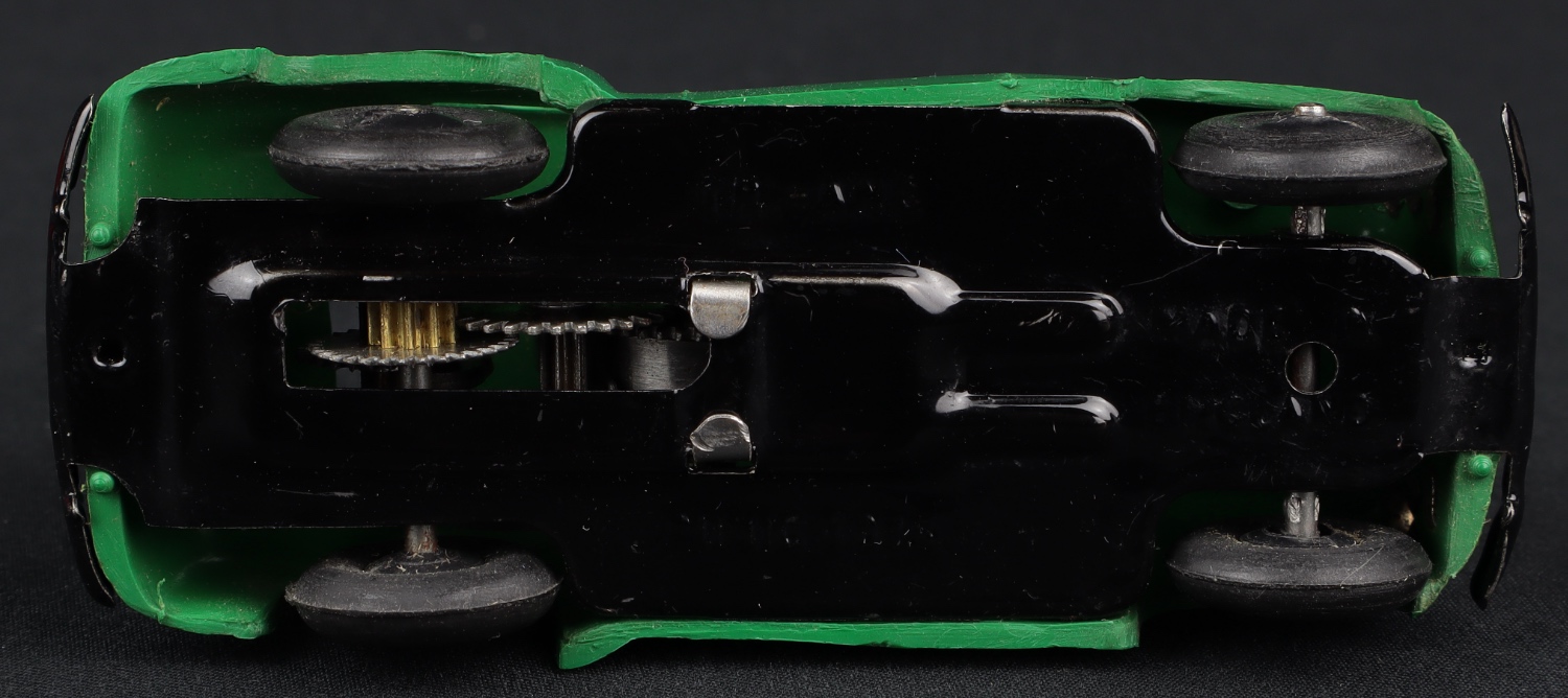 From 1953, this endearing Hillman Minx Car in plastic has a vivid blue finish. Working clockwork motor. Black wheels and complete smooth original tyres. Intact shiny black bumpers, shiny radiator base. Glossy black base.