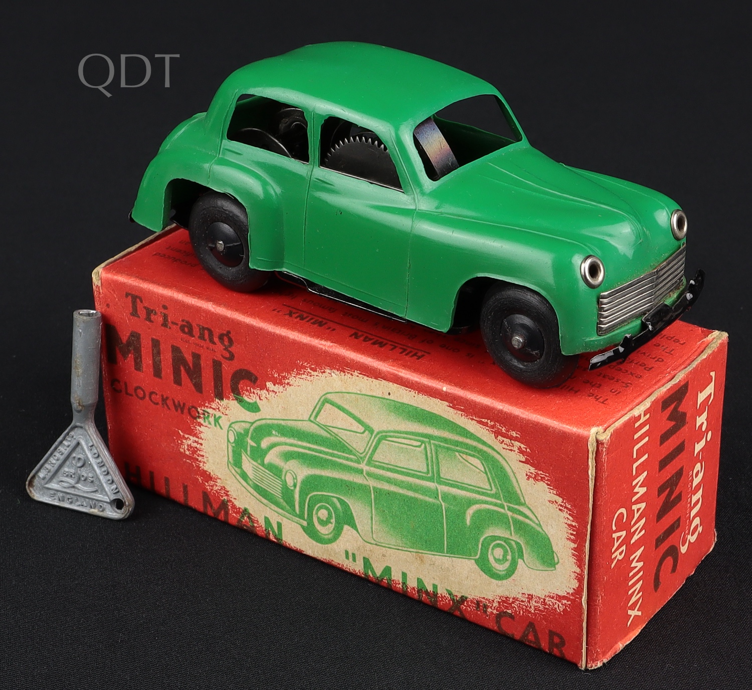 Hillman Minx Saloon by Triang Minic Models, No.102M. Scarce. Clockwork issue. With original Minic Key. Very near mint /boxed. Starting bid £75. Please note that QDT apply 12.5% buyer's commission.