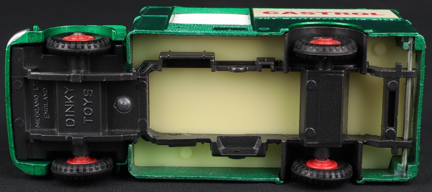 Issued between 1965-70. In metallic emerald green finish, with white shutter doors, red plastic hubs, red interior. Nice to see that the “CASTROL” labels at the sides and behind the cab roof are looking so bright and fresh (with none of the usual age transparency which seems to plague these models).